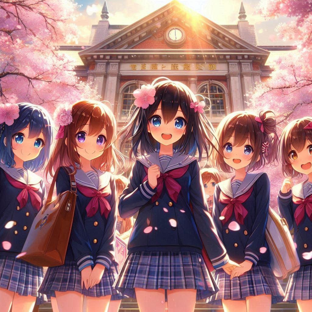 意図:桜舞う小学校の入学式、ピカピカの制服とランドセルを背負った少女たちが希望に満ちた笑顔を見せるシーン。