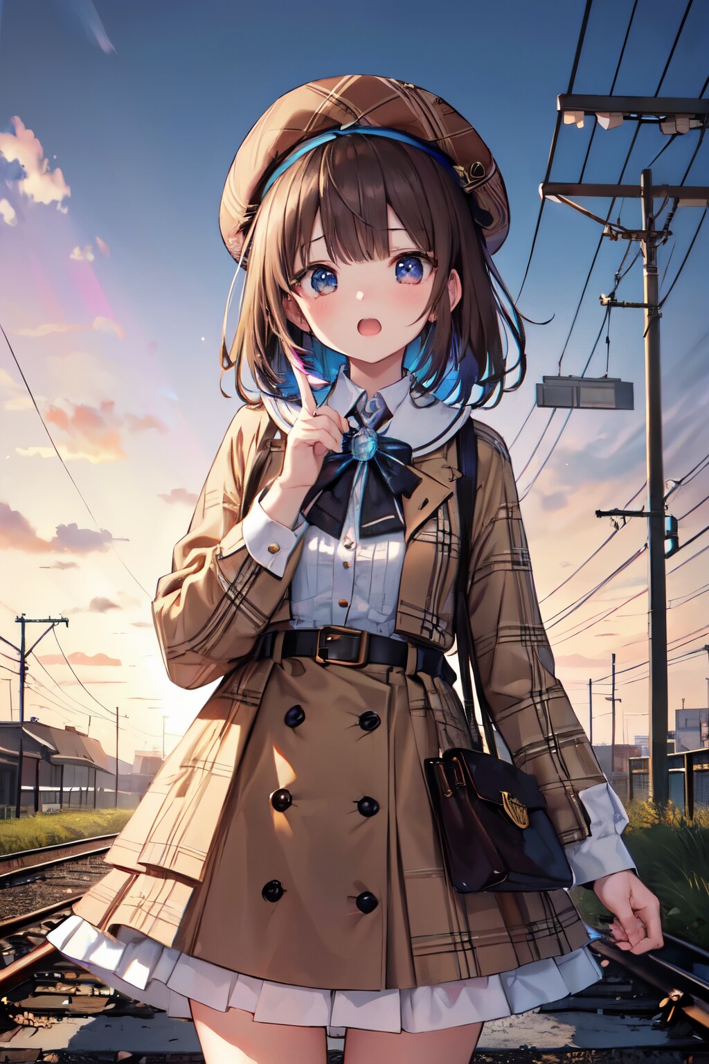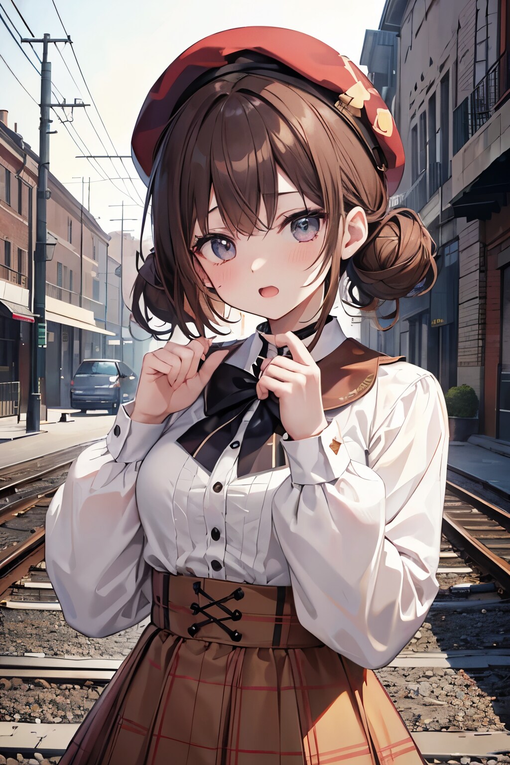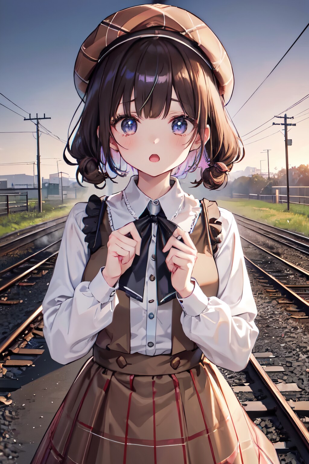 今回はバーバリーチェックのティアードスカートにベレー帽、花びらに似た形状であることからペタルカラーという名称である襟の付いたシャツ、という服装の女の子が線路上に立っているイラストを生成したくて作りました。