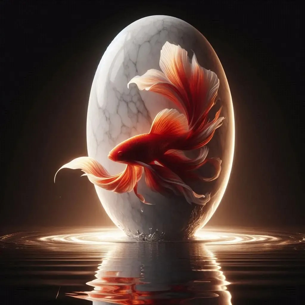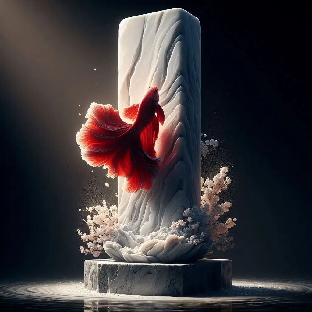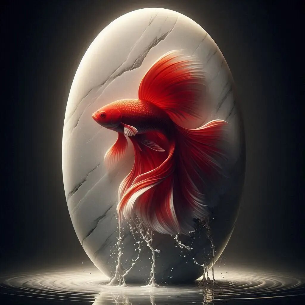 赤子の尾びれは、夜の冷たさに僅かに震えながら、その白い石へと惹きつけられる。紅(くれない)に染まった尾は、贅沢なほどに豊かで、丸々と満ちた曲線を描いている。まるで、熟した生命が、今にも弾けんばかりの張り艶を宿しているかのように、プリッとしたまーるい優雅さを湛(たた)えている。それは、水面に描かれる波紋のように、そして、人の肌に触れる指先のように、甘く、誘うような曲線であった。