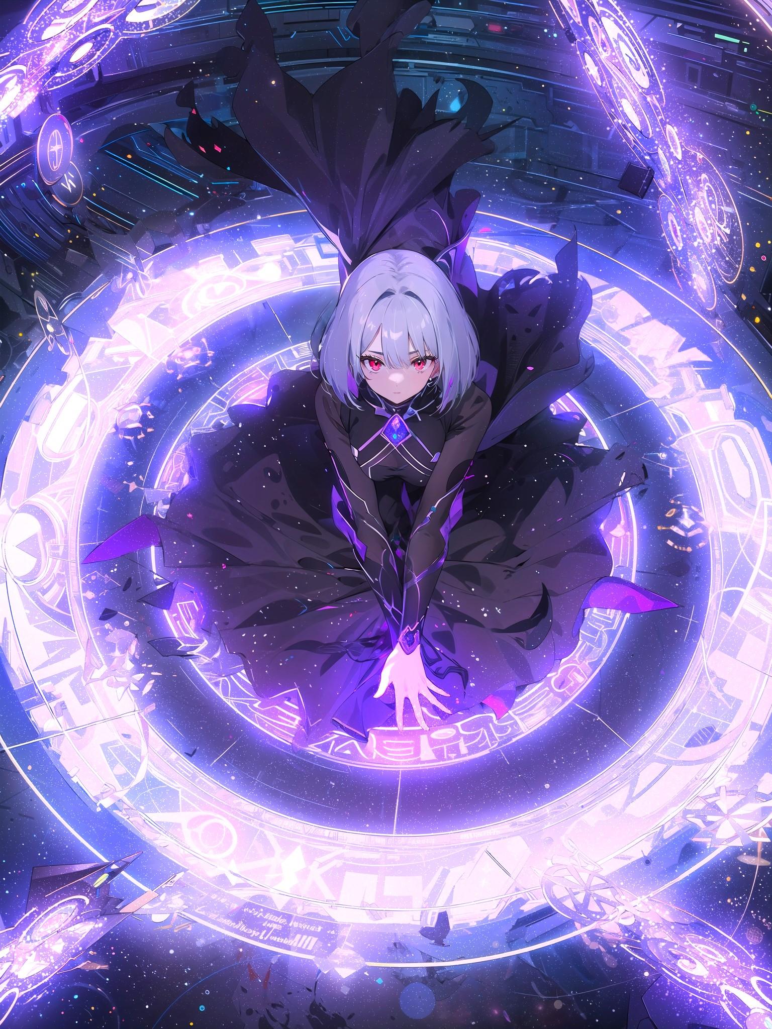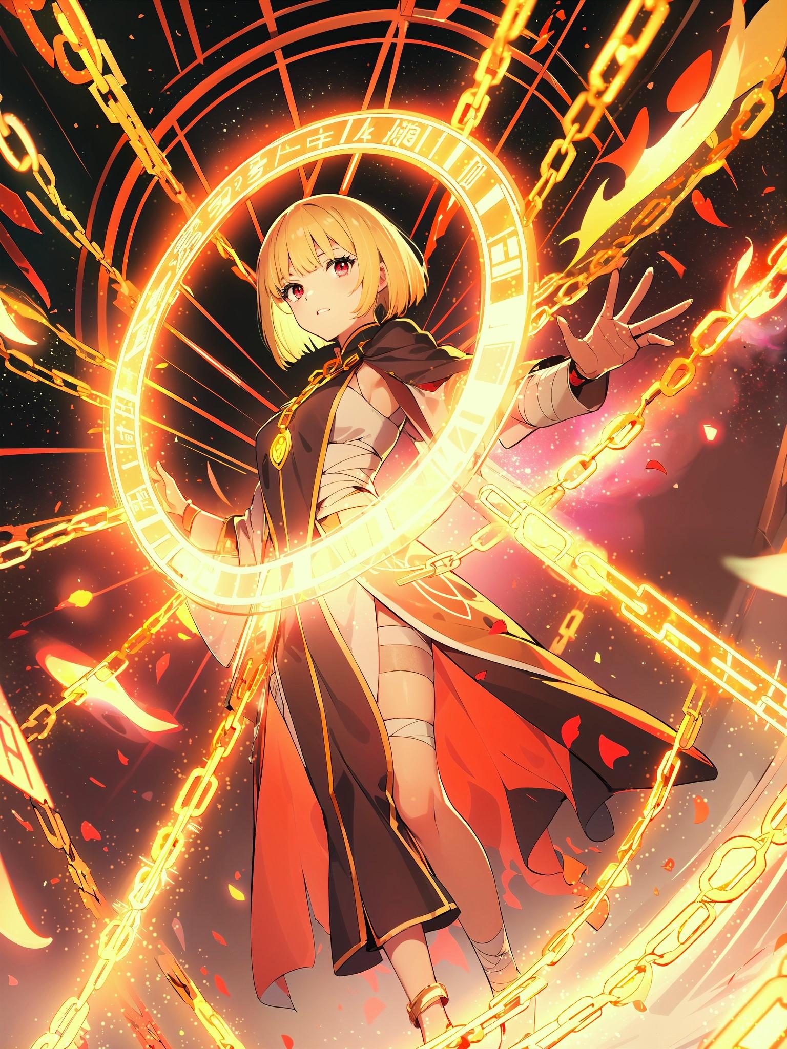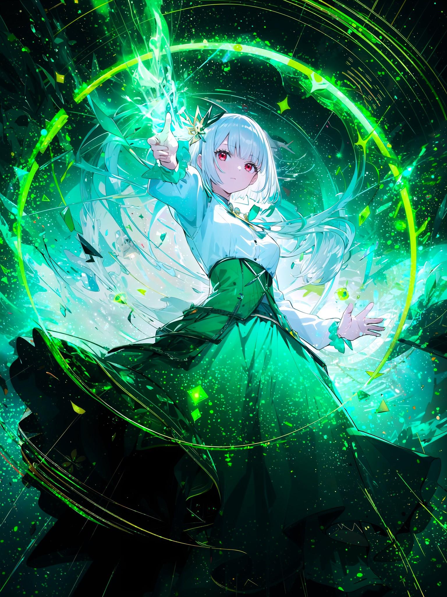 (キャラクターの見た目),dancing in a circle of light and (任意の色) lights, (服装), Ancient magic circles, (任意の特徴), miracles, powerful magic, light aura, official art, (任意の構図) and looking at viewer