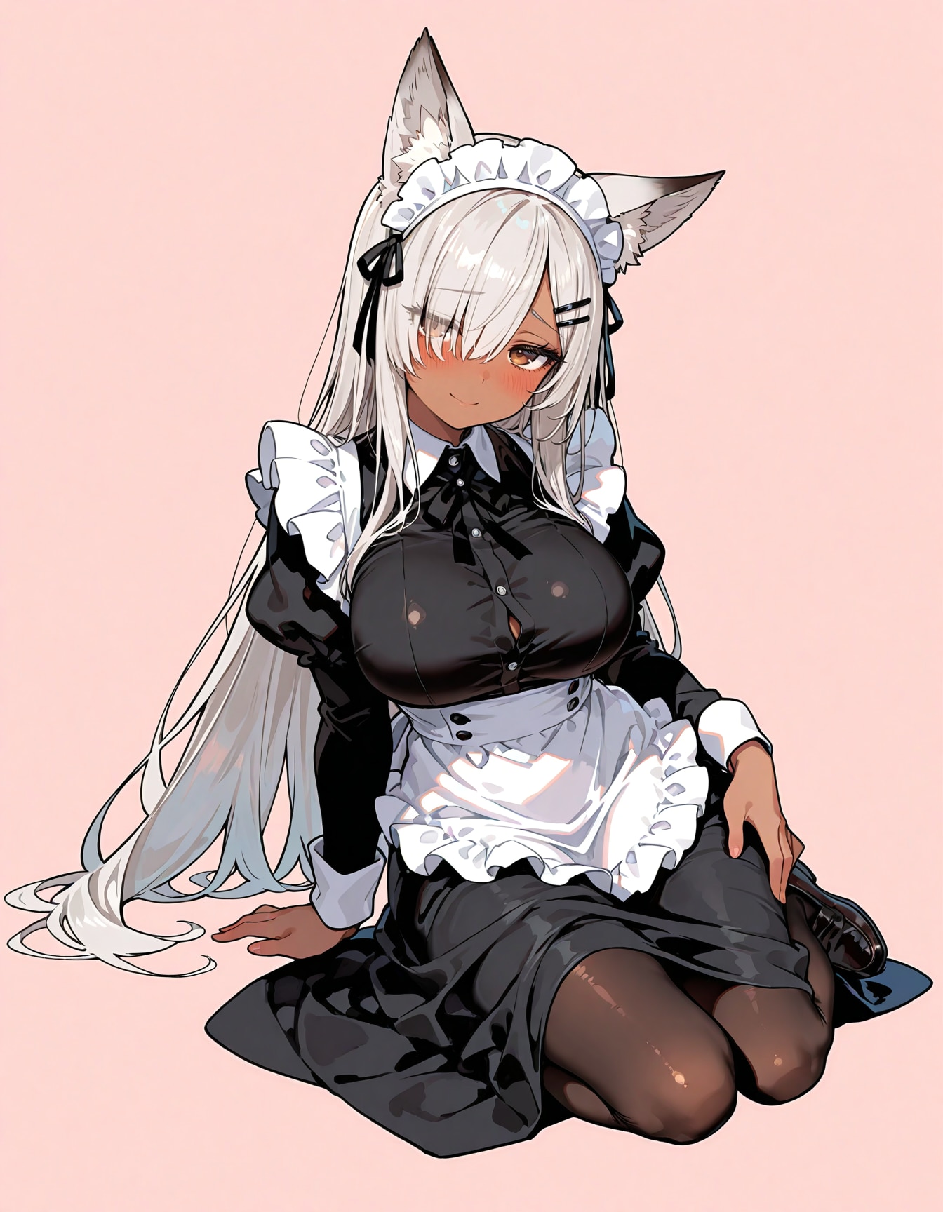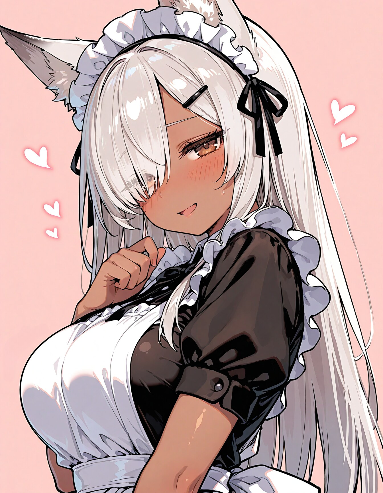1girl,solo,(dark skin:1.2),curvy,shiny skin,hair over one eye,(eyelashes:1.1),jitome,half-closed eyes,brown eyes,fox ears,silver hair,straight hair,long hair,large breasts,open mouth,black hairclip,
