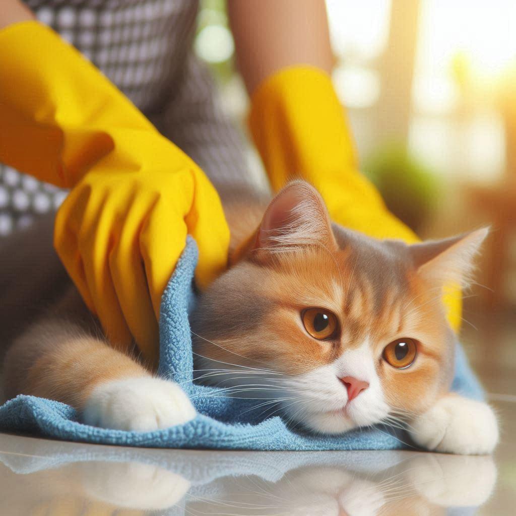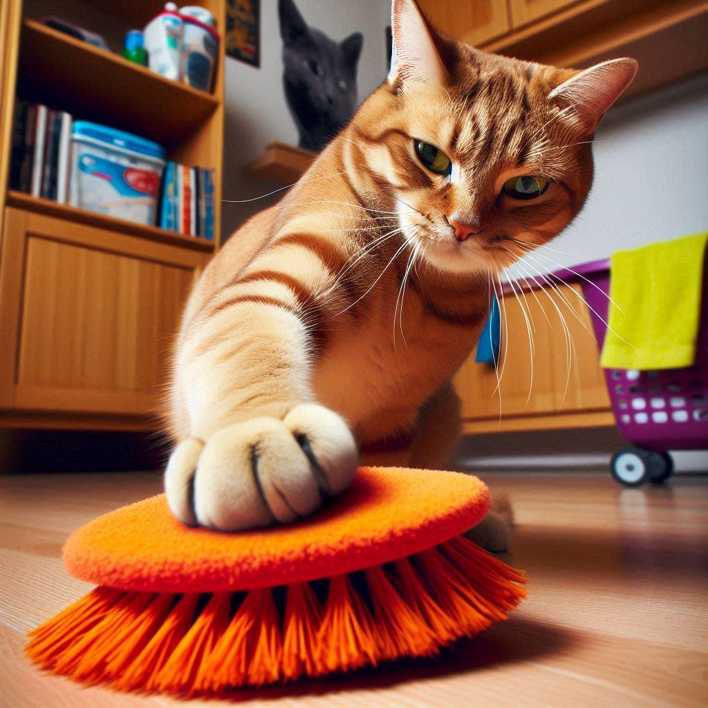 掃除させられる猫