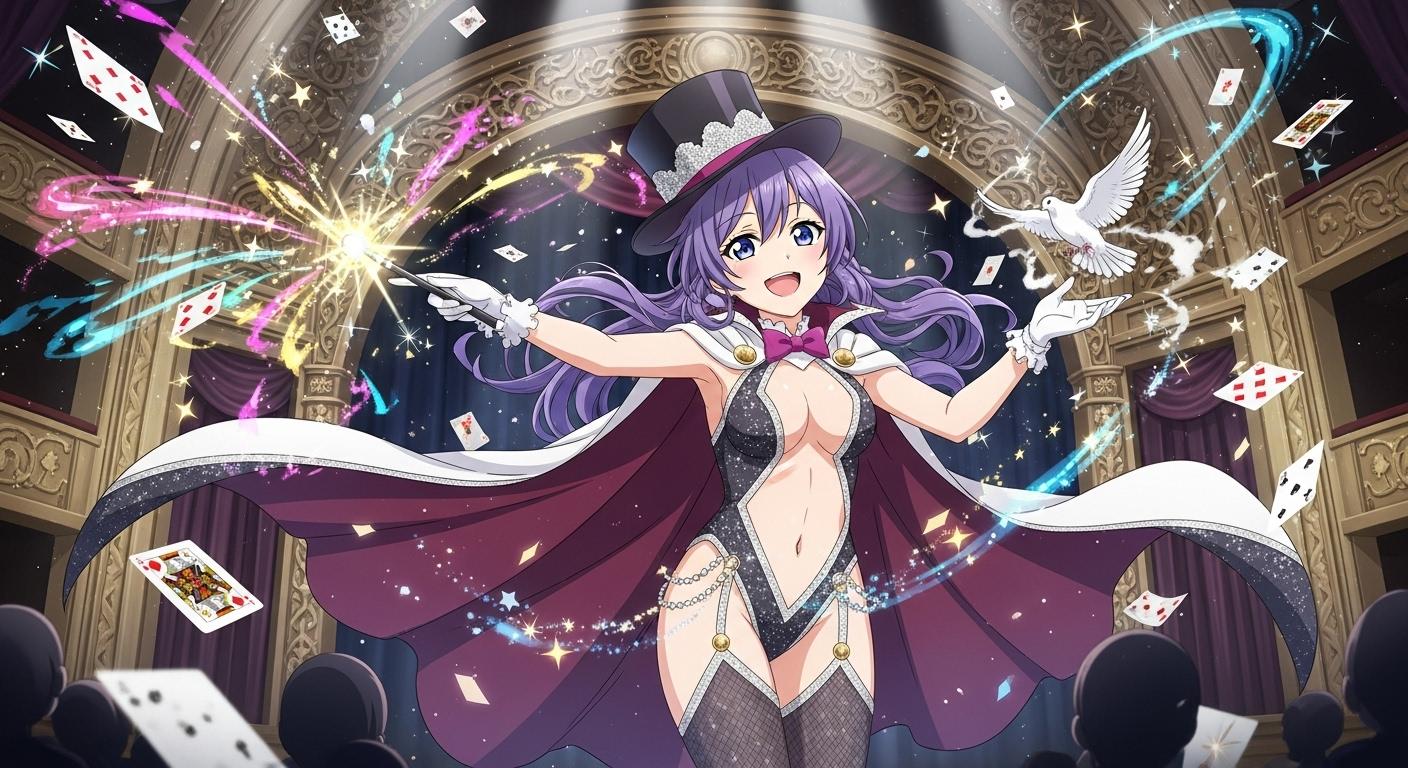 実は、同時刻R-15投稿品を生成する際の副産物で、この三つ編み眼鏡っ娘の美少女マジシャンちゃんは、悪の美少女マジシャンだった!っていう裏設定画があります😅💦。