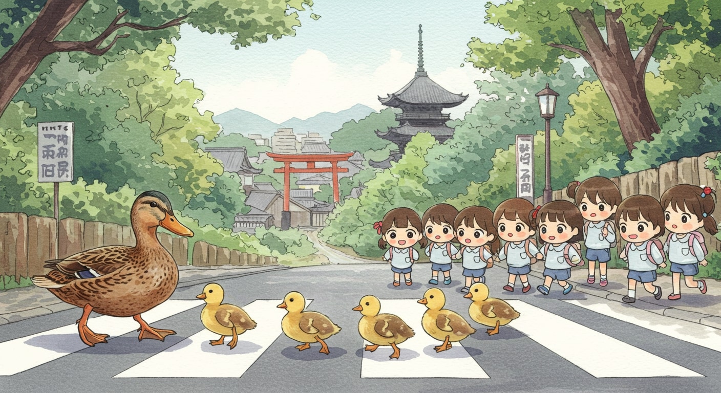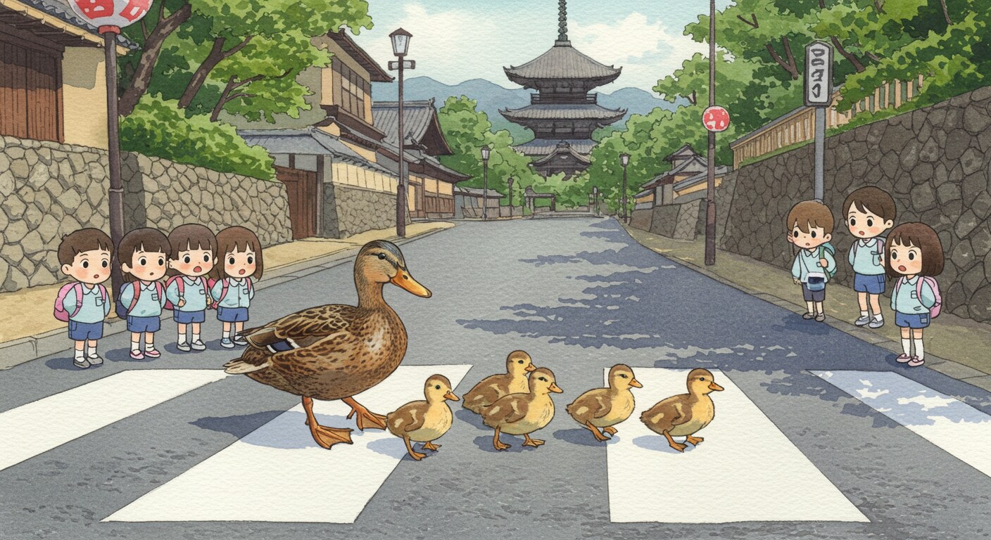 カルガモの親子の移動が確認されると、車を止めて見守る。