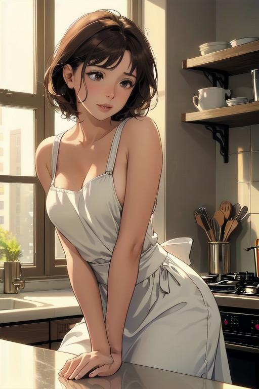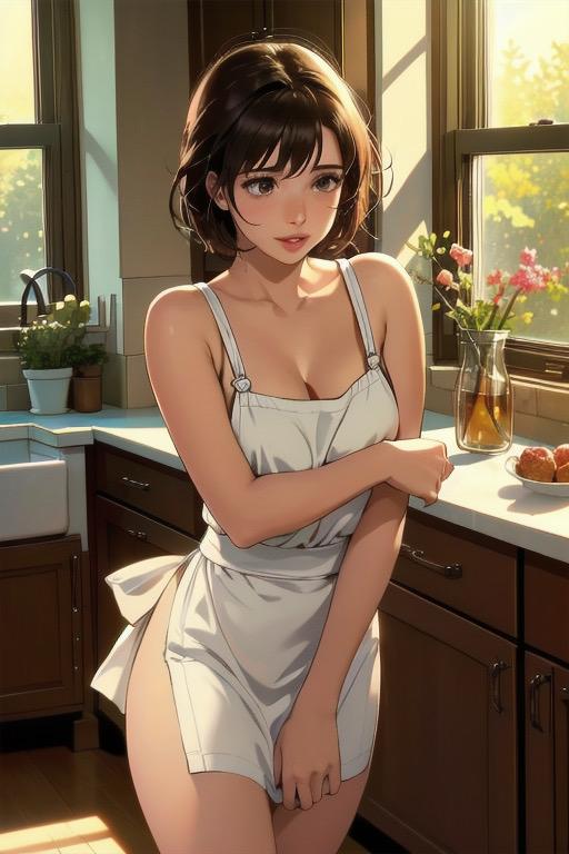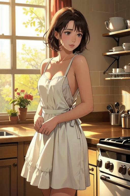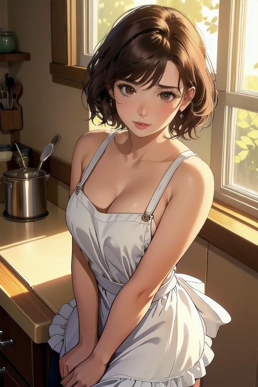 白いエプロン一枚で微笑む彼女の姿。
