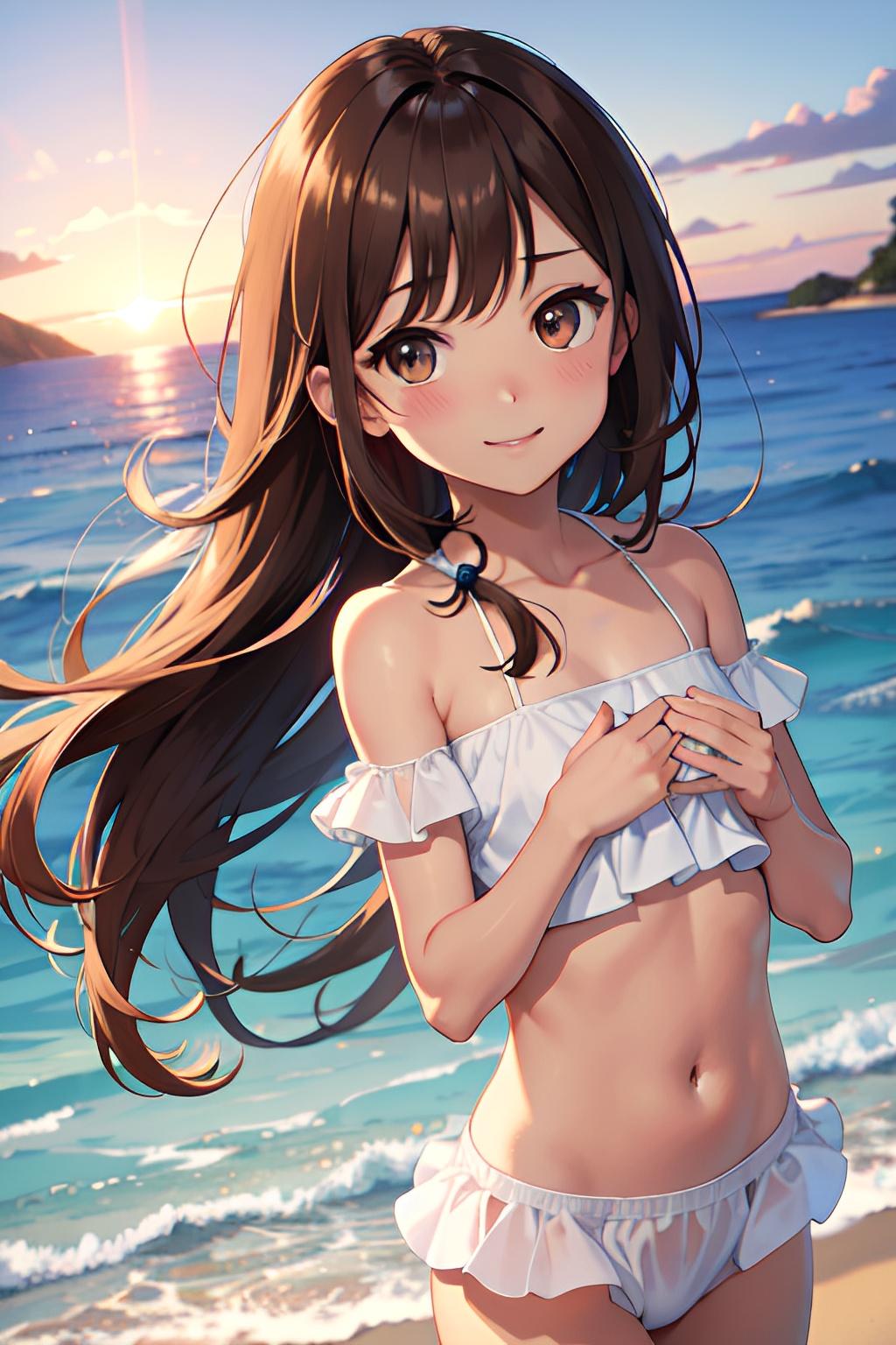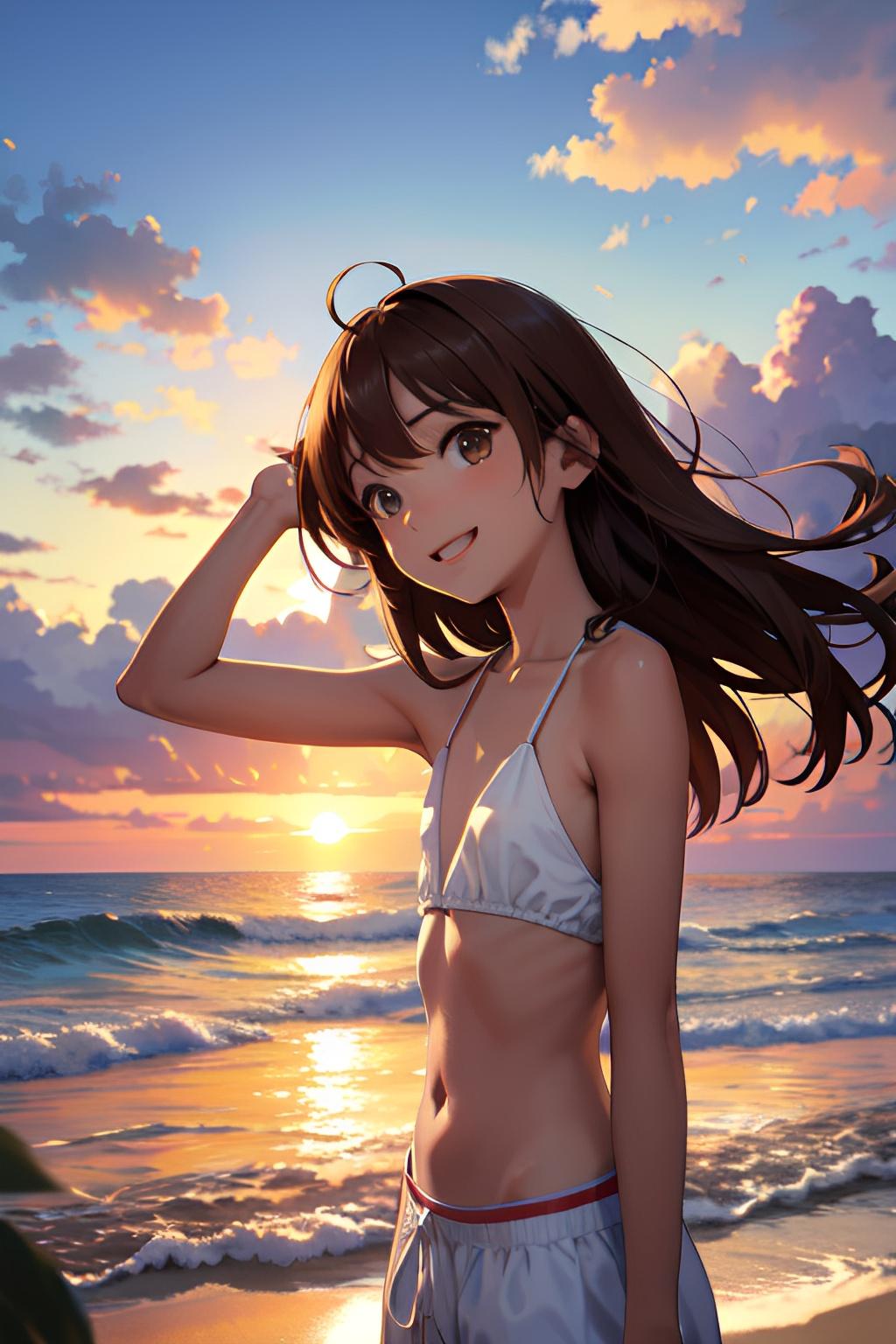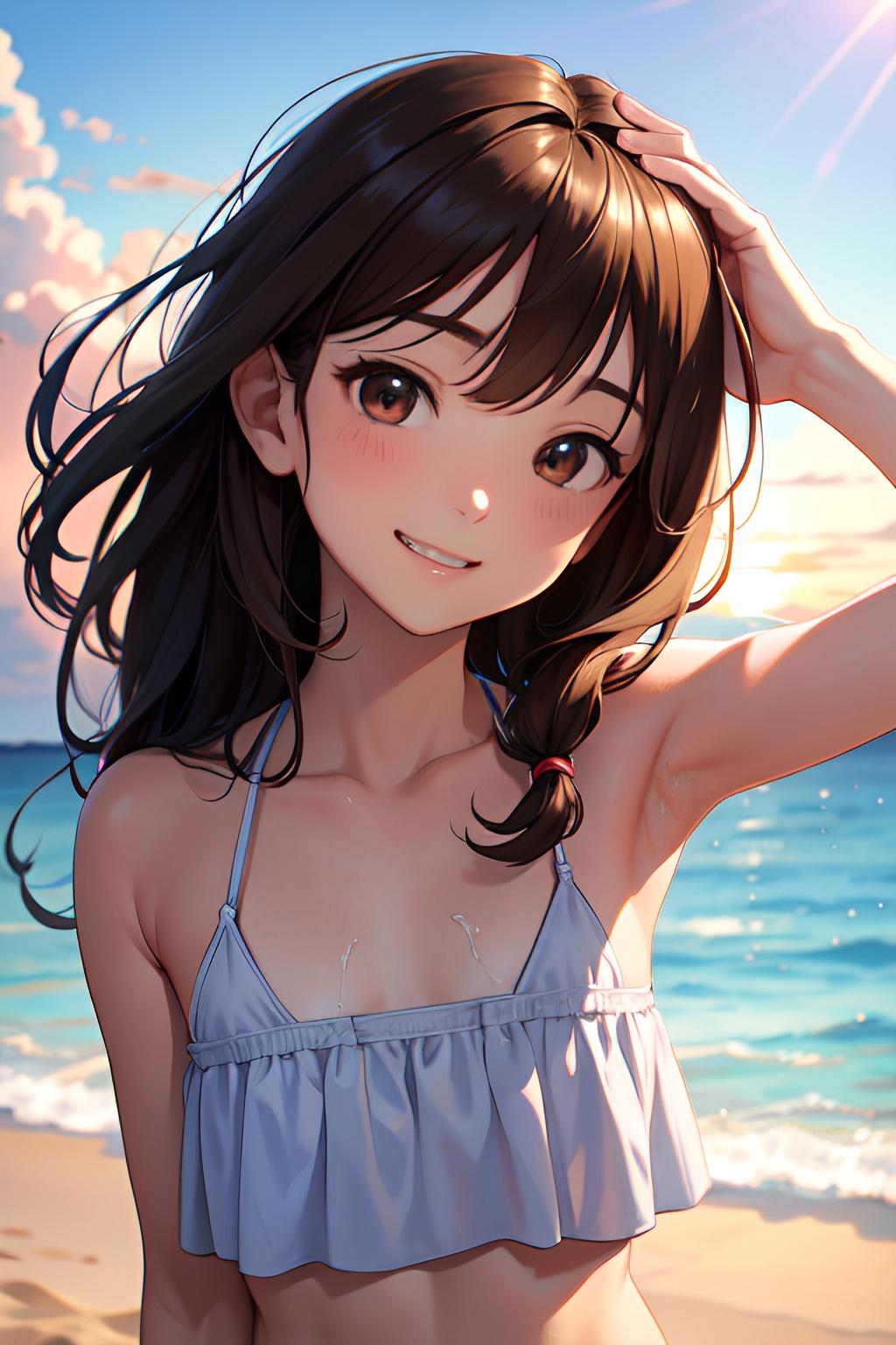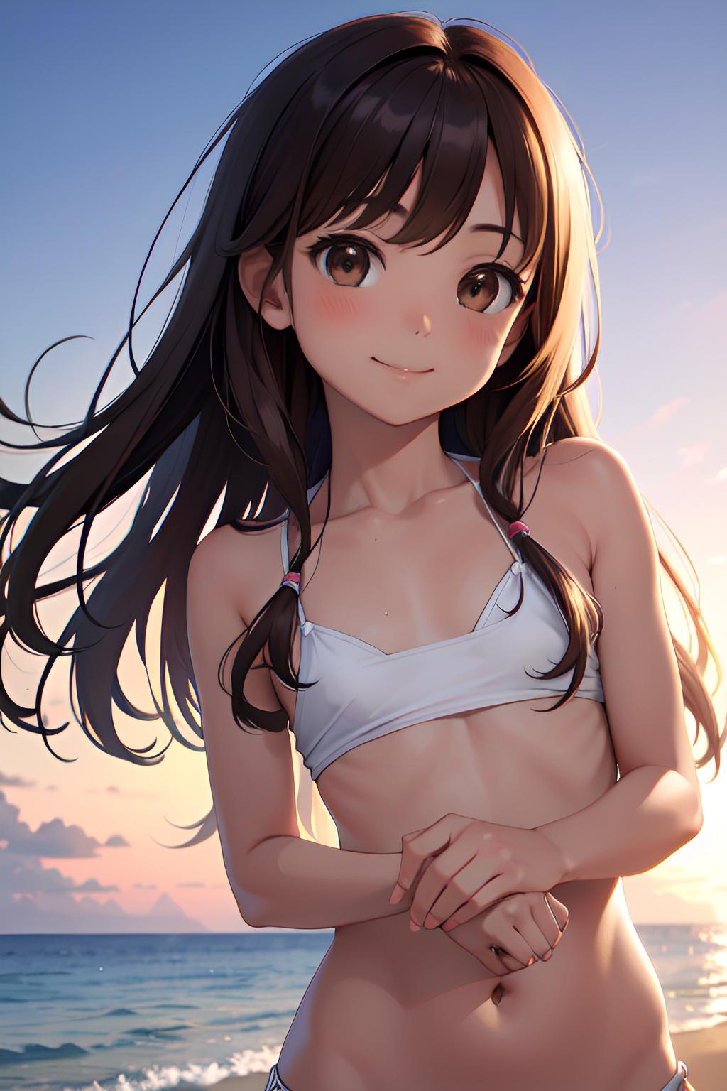 海辺で日焼けした貧乳の少女