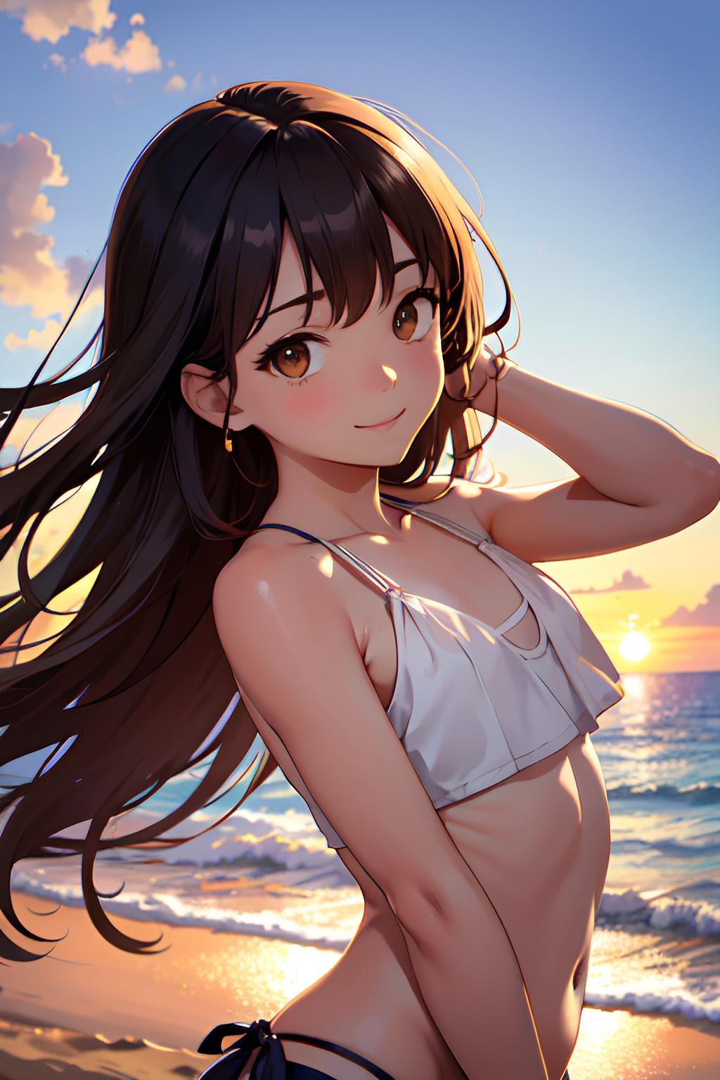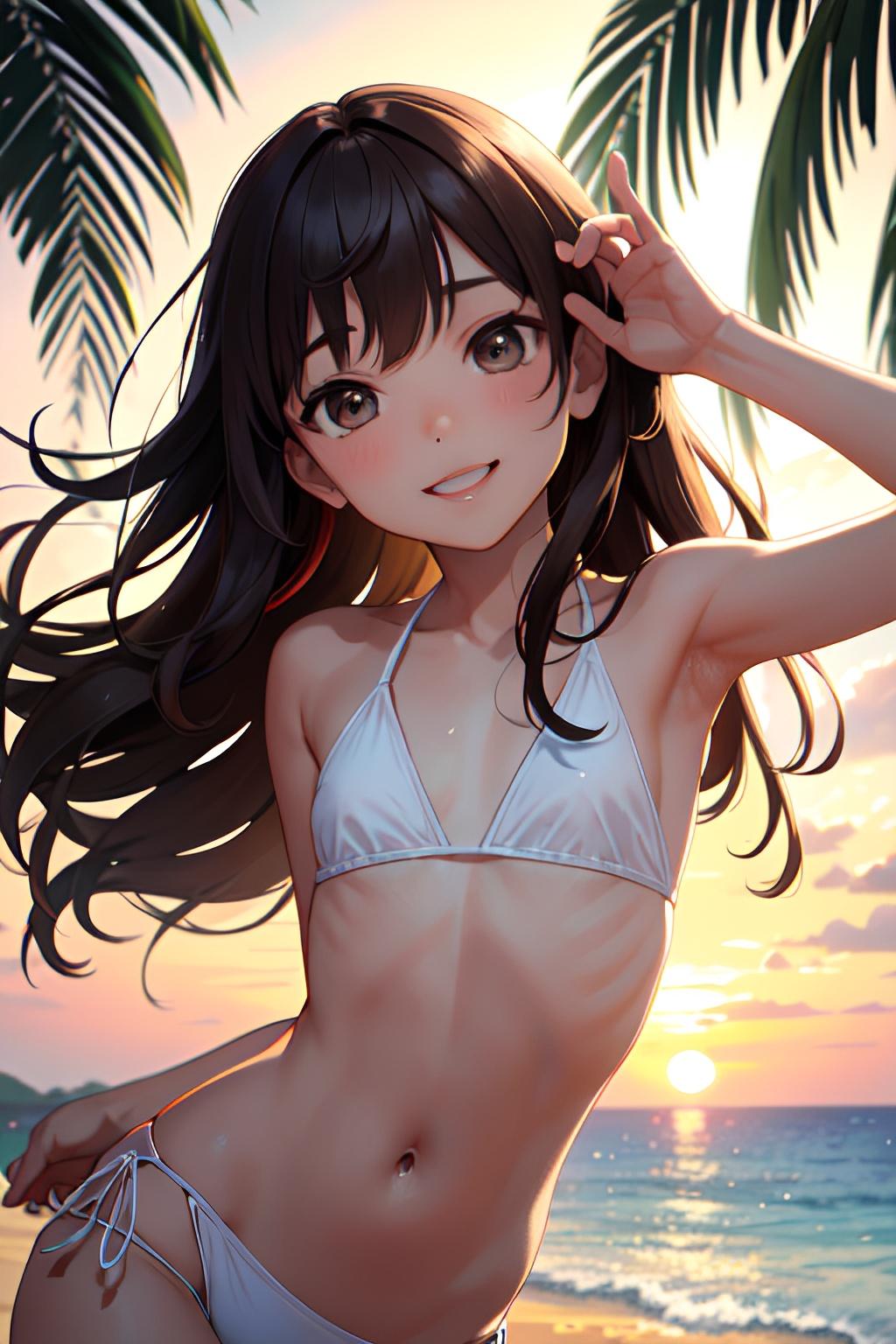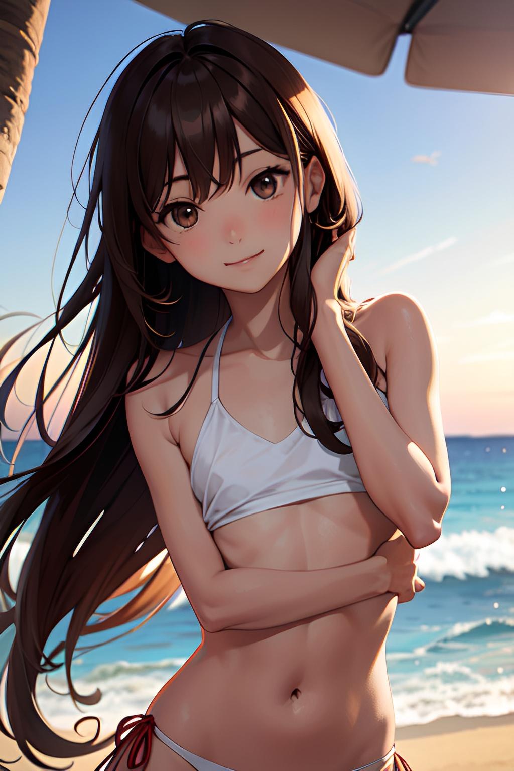 海辺で日焼けした貧乳の少女