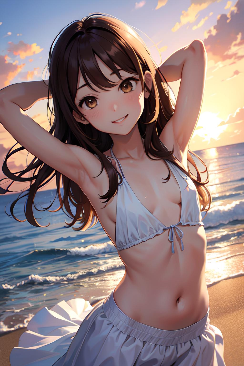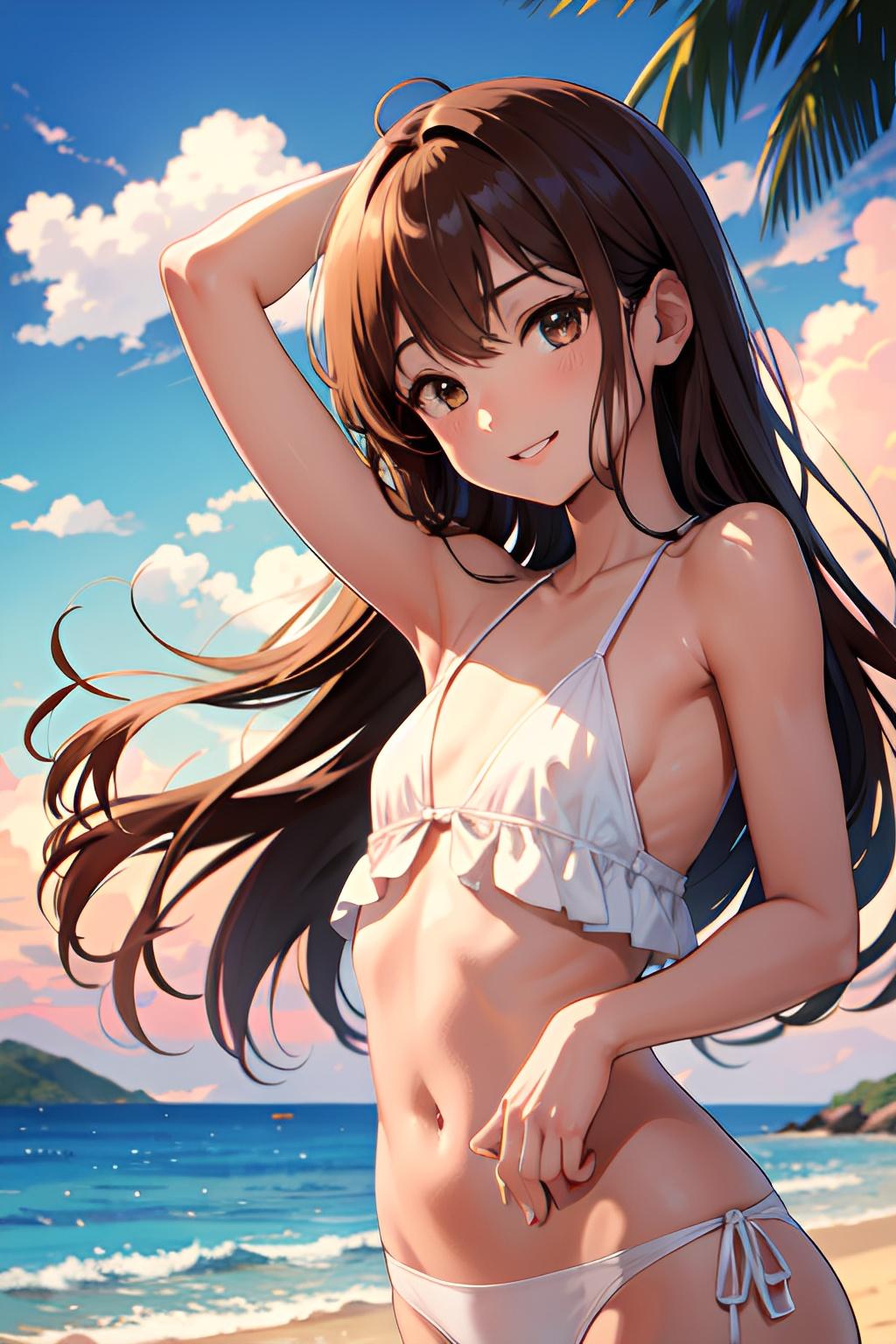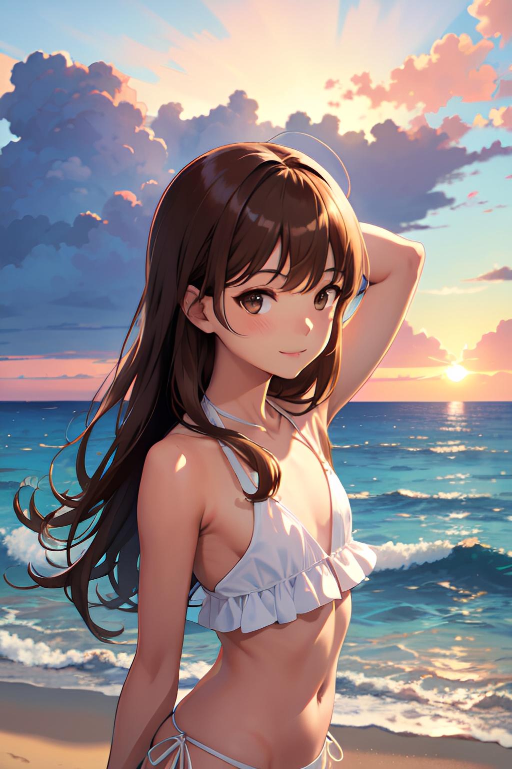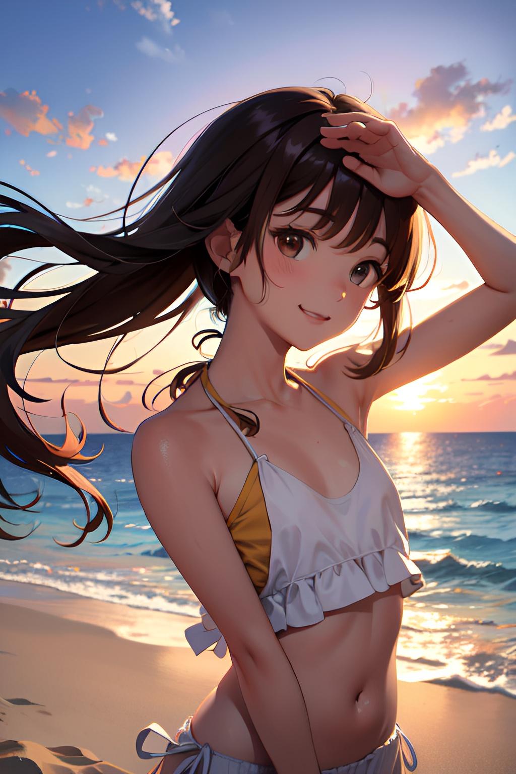 海辺で日焼けした貧乳の少女