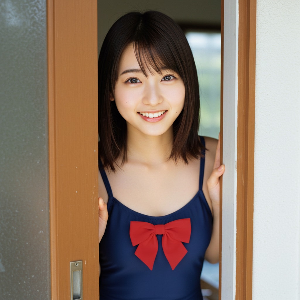 日本語「水着の胸の真ん中に赤いbowが付いた、紺色のワンピース水着を着た日本の女優、ミディアムヘア、黒いローファーと紺色のソックス、」