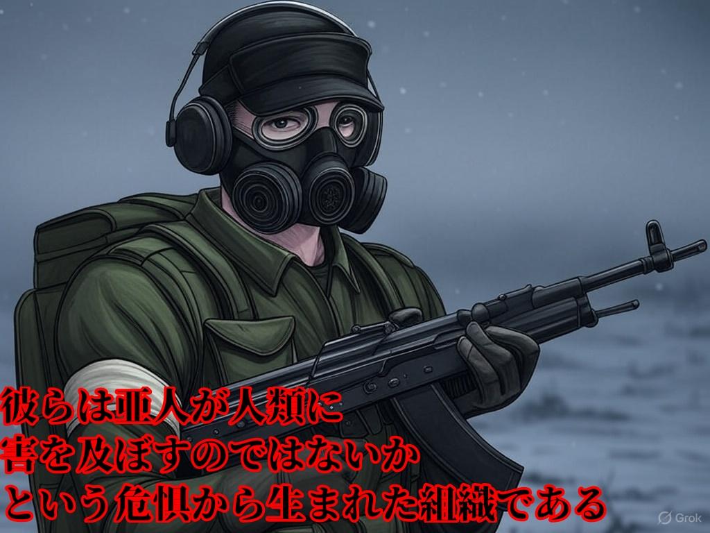 構成員の特徴、彼らは亜人の吸う空気が有毒なものと考えているため、常時、ガスマスクとADEの文字が書かれた腕章をつけている。