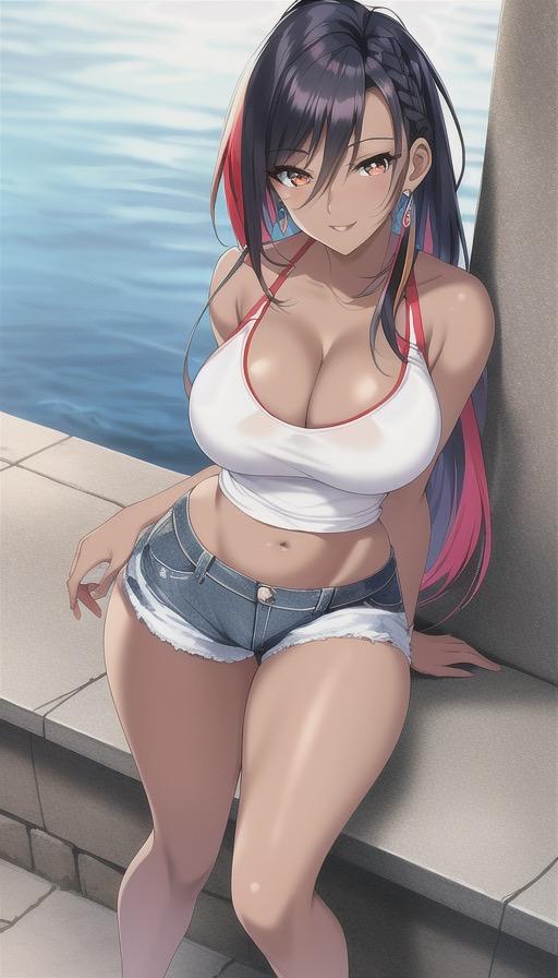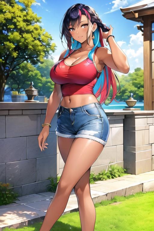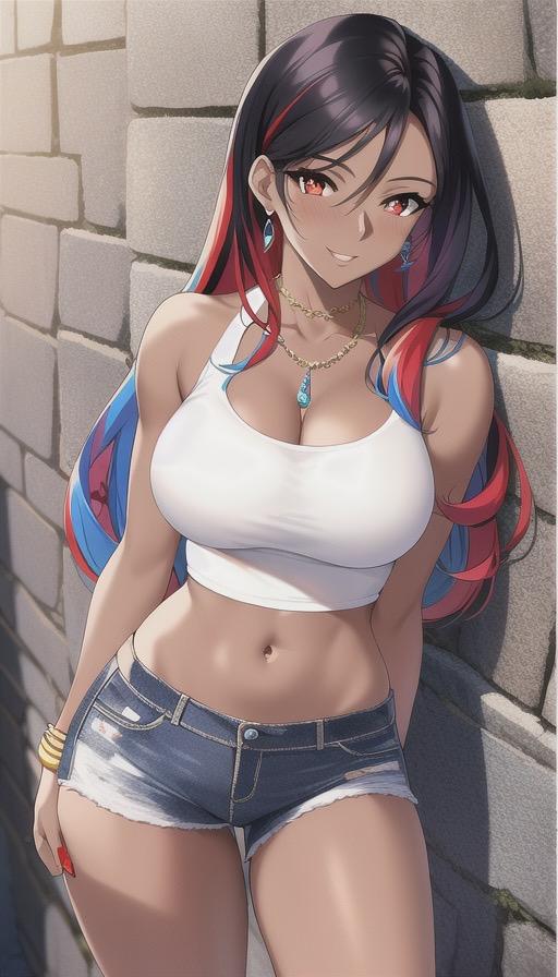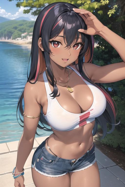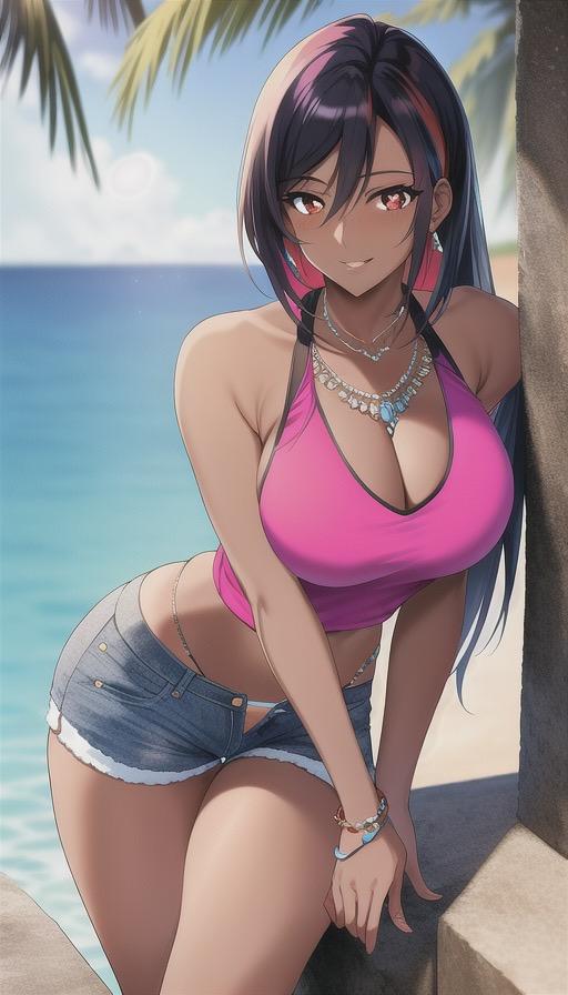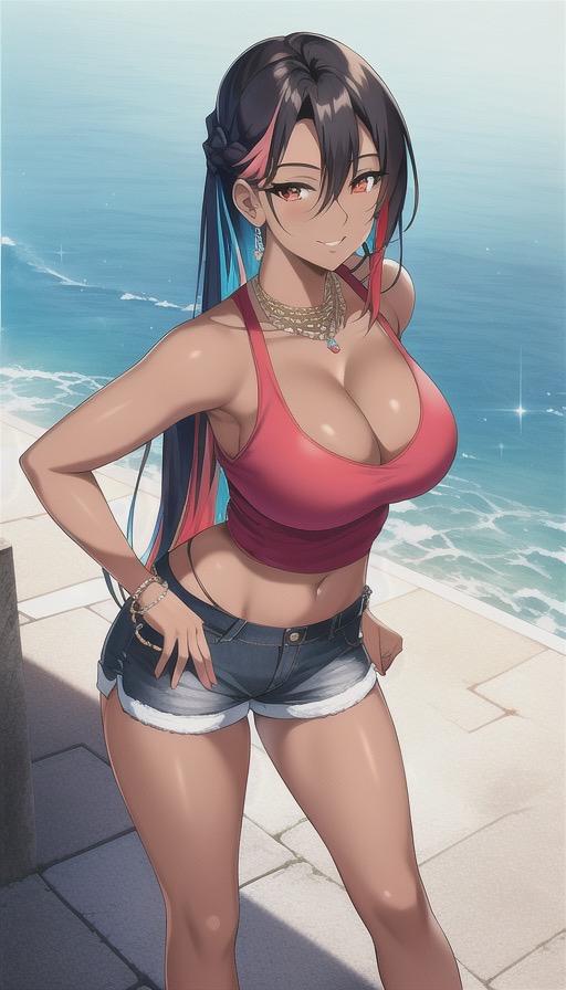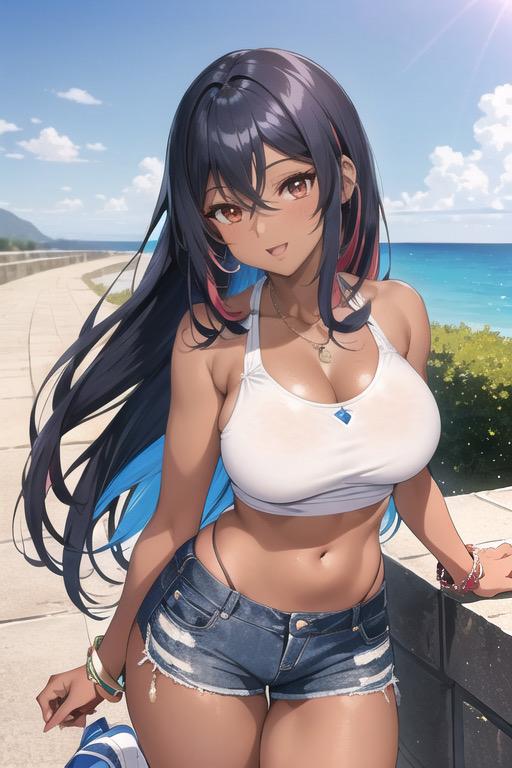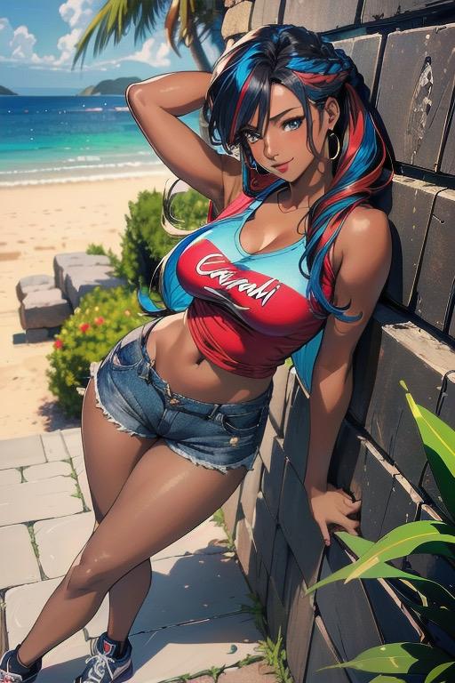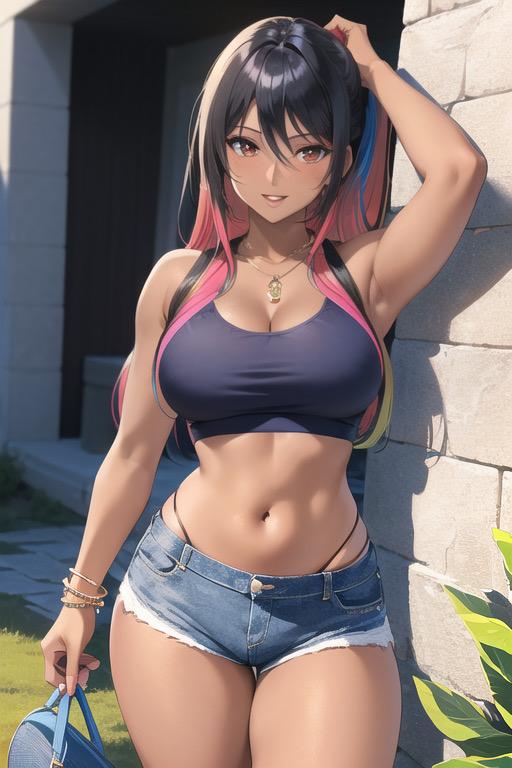 カラフルなタンクトップにデニムパンツ姿の褐色美女