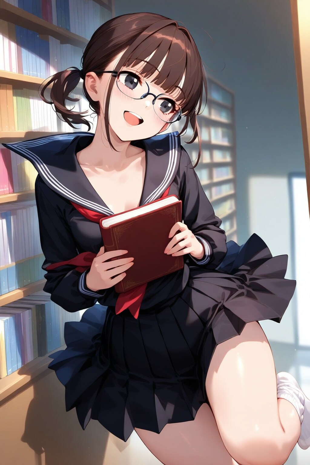 今回は企画期間もギリギリということで図書館を舞台にした作品の撮影の普通に服を着てるところの場面の撮影をしてる。という感じで生成しました。もちろん眼鏡三つ編みで。…ですがさすがにぱっと見で雫ちゃんだとはかなり分かりづらいかと思ったので通常の髪型の雫ちゃんも生成しました。