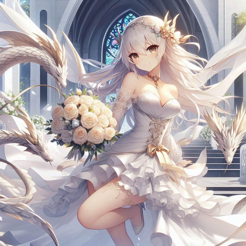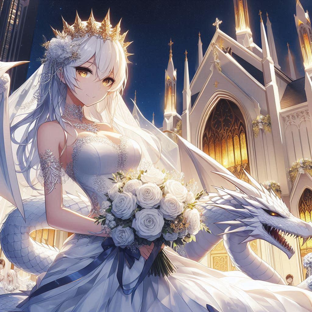 白き衣(ウェディングドレス風)を纏いし美女 と 龍(竜)(ドラゴン) の組合せですが、