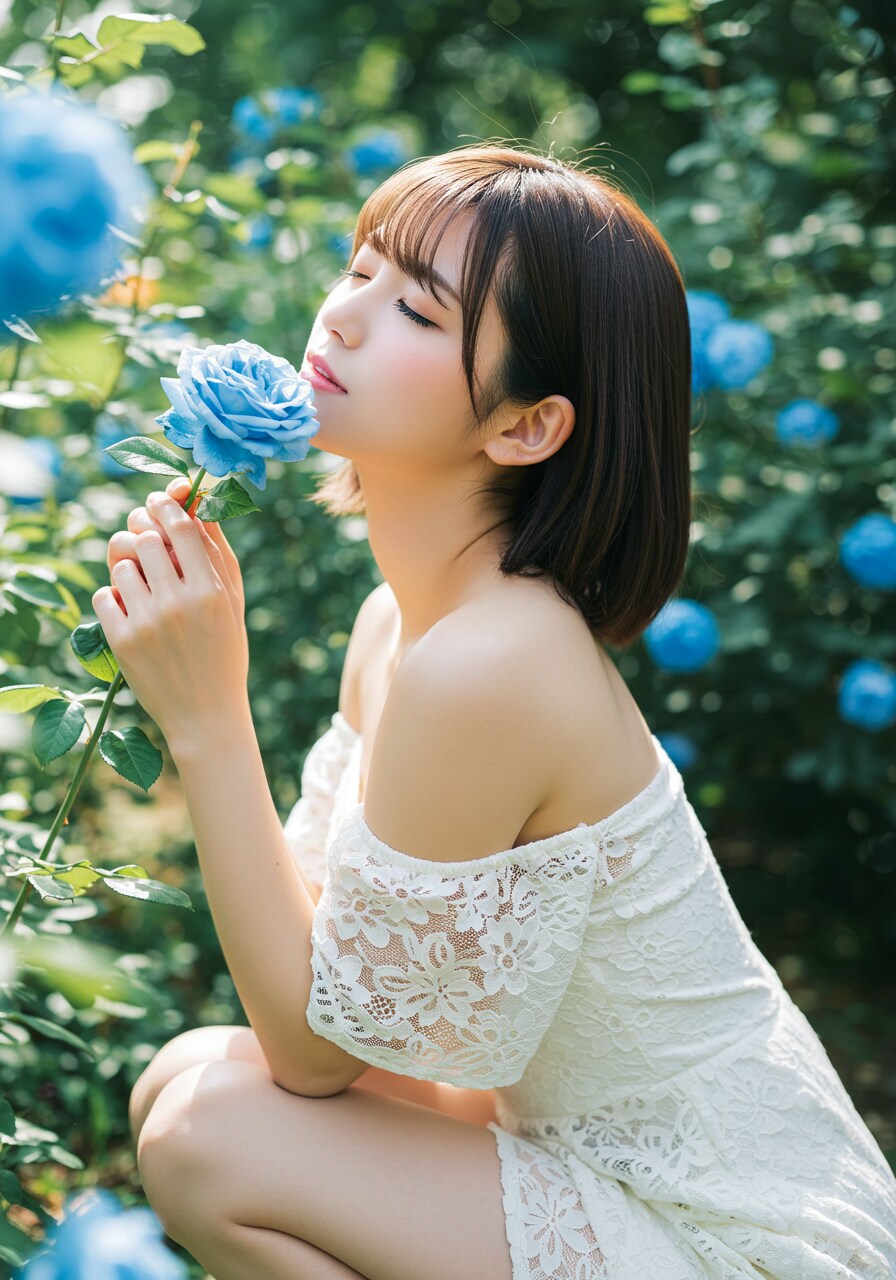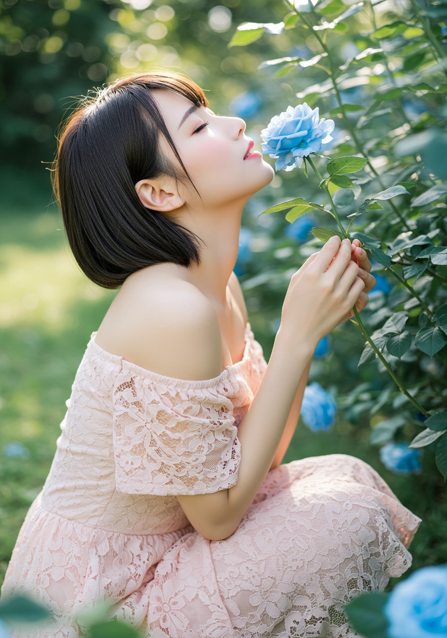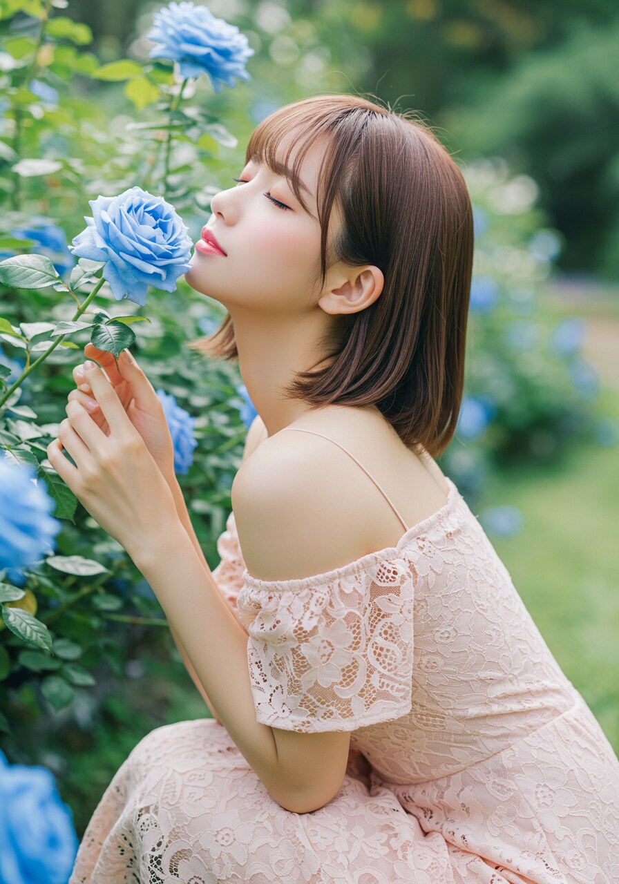 日頃ストレスをお持ちのお嬢様がバラ園での花の香りに陶酔している様子です