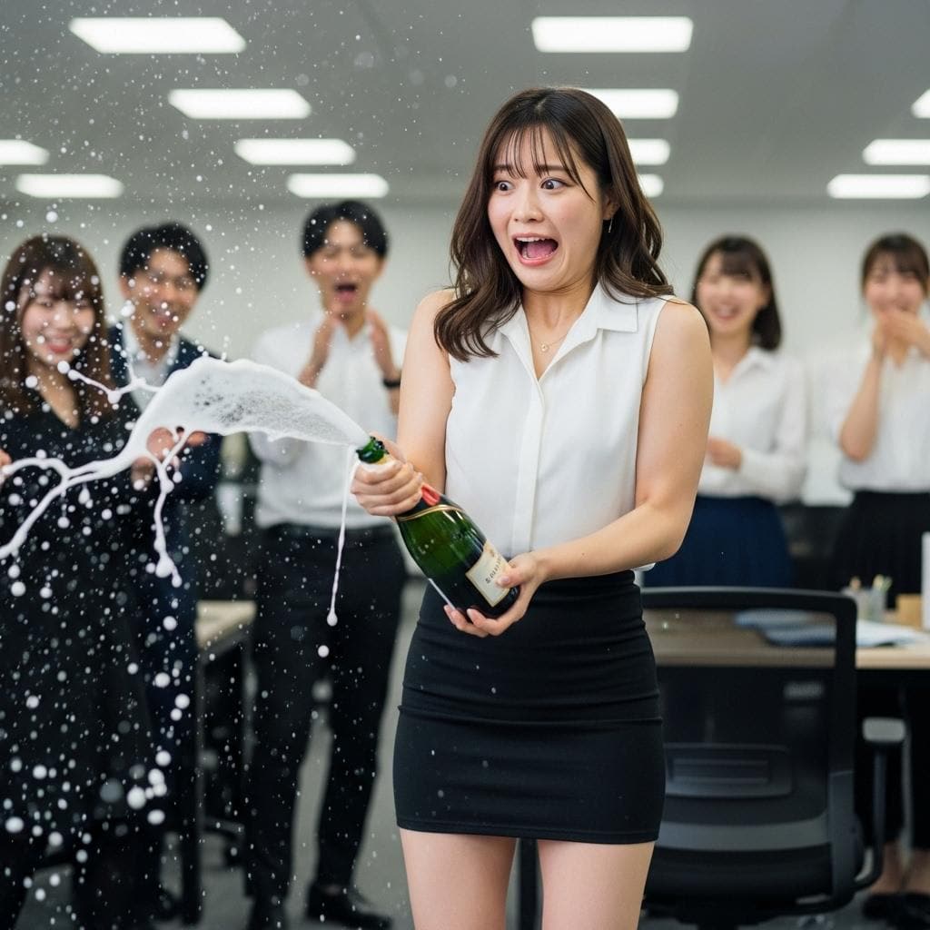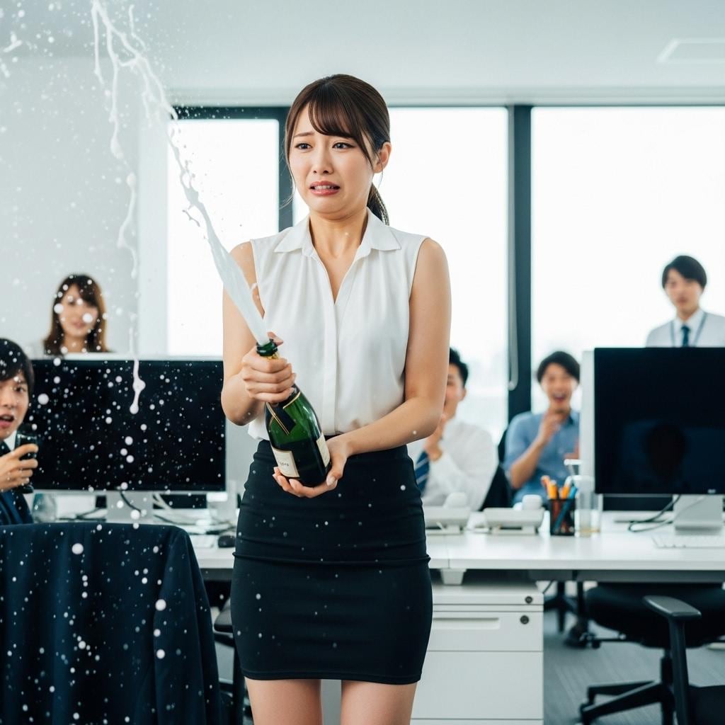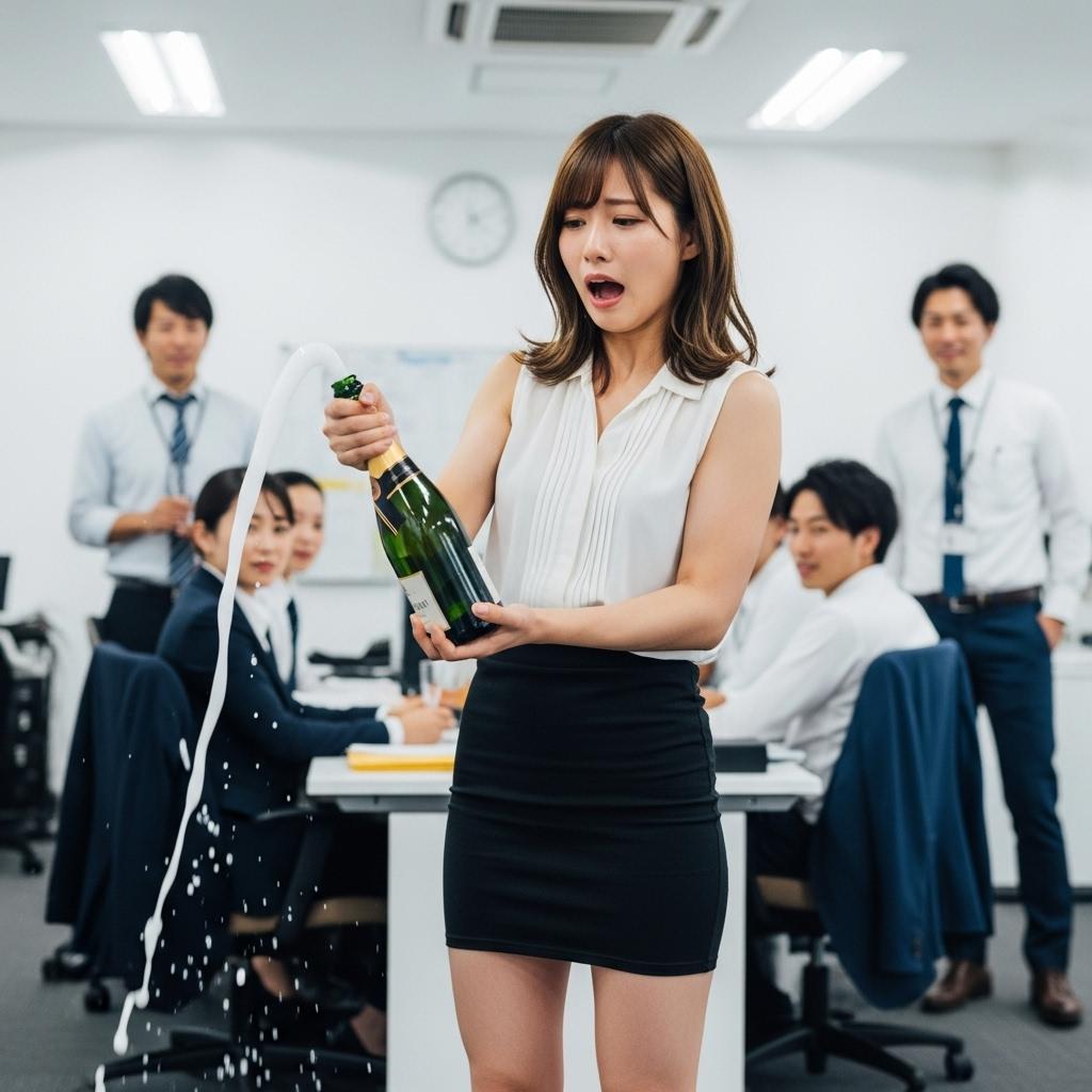 (きれいなOLさんが、オフィスで、いきおいよくシャンパンを開けると、とてもよろこばれるサービス)(^^♪