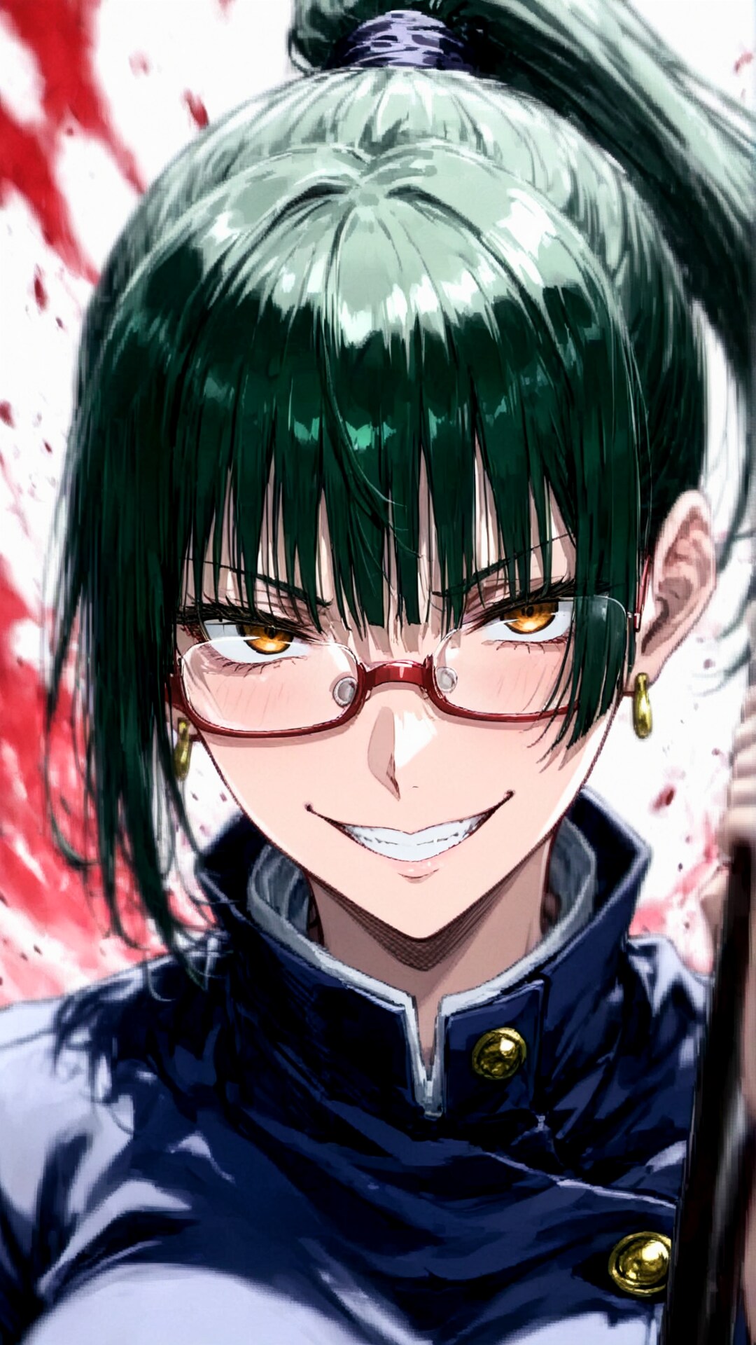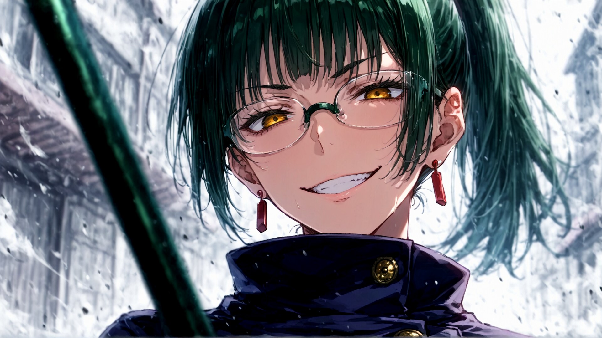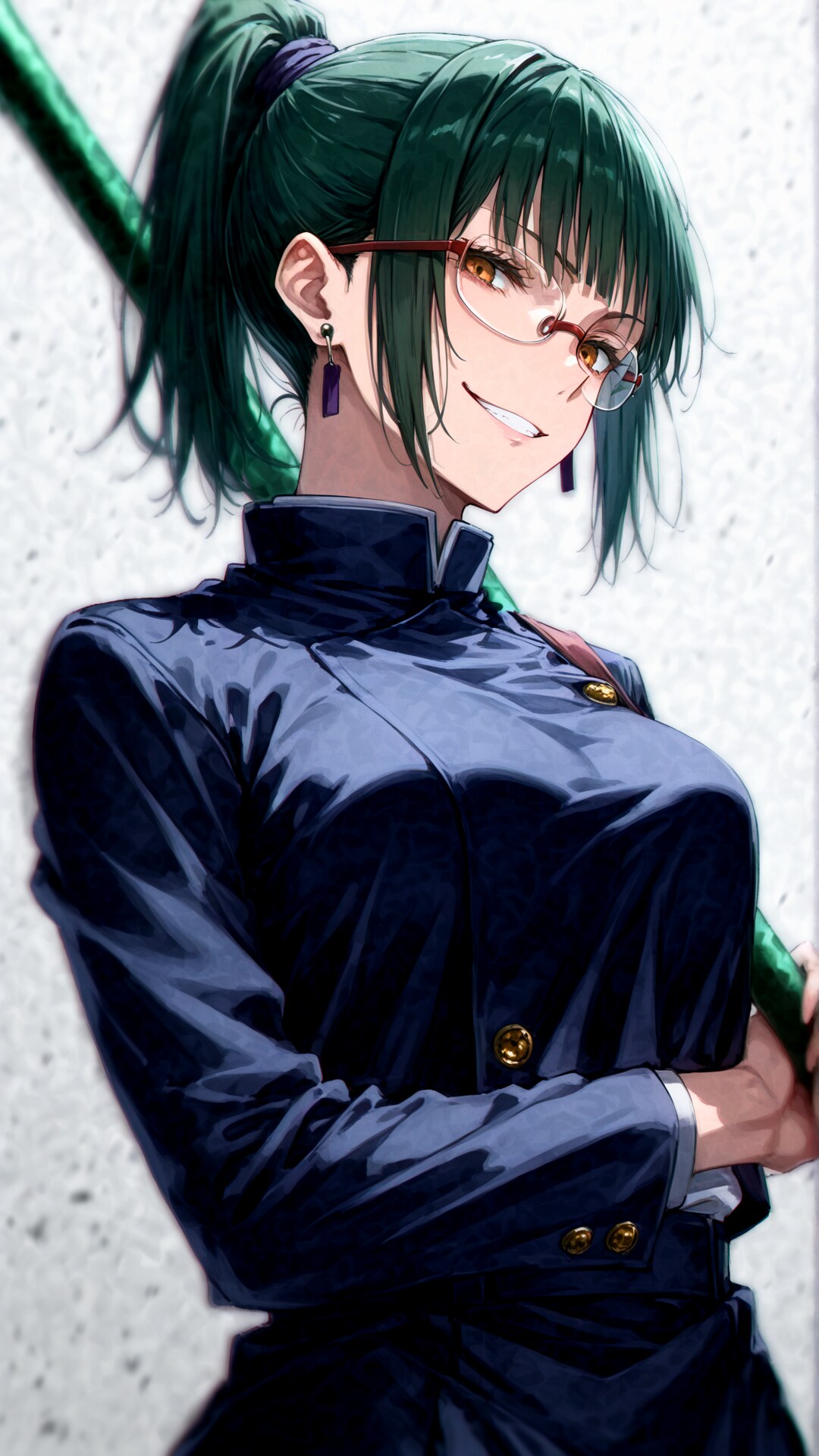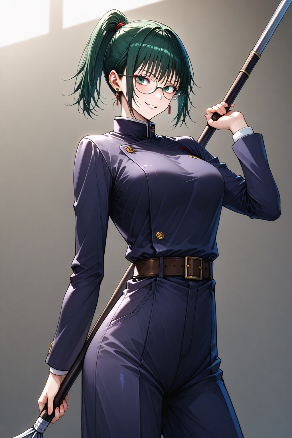 zen'in maki, glasses,high ponytail, jujutsu kaisen, jujutsu tech uniform,でIllustrious系で作成可能