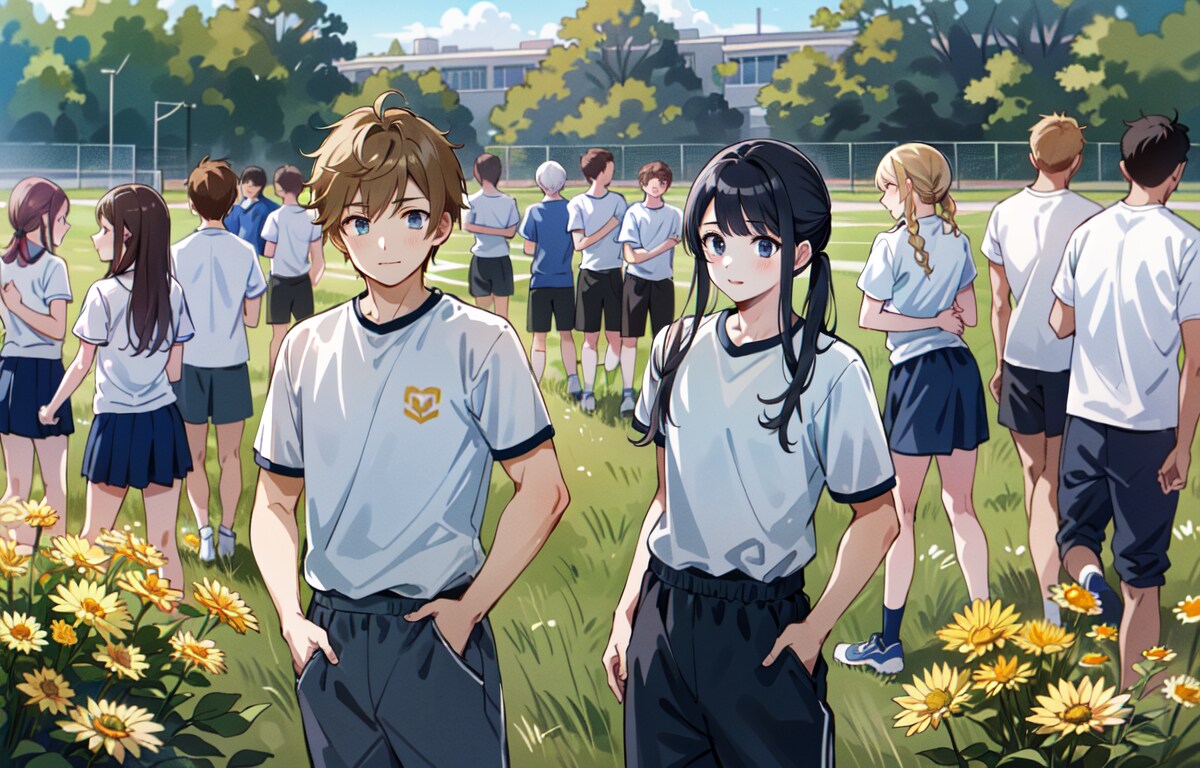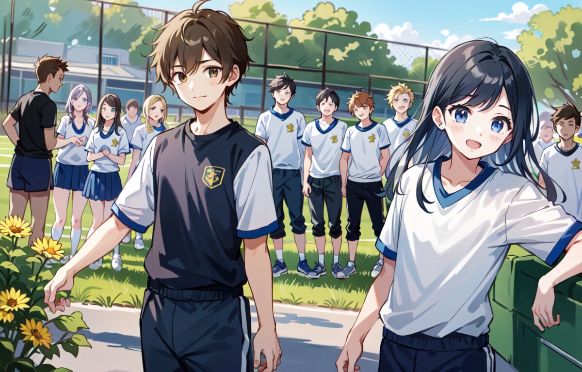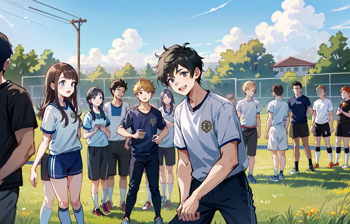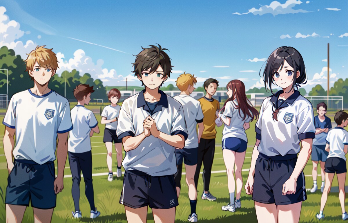 運動会お題ということで考えても、どういうシチュエーションで生成していいか分からなかったため、ほぼAIにおまかせして生成してみました。結果、運動会の練習しているような風景しか出てこなかったです…!運動会感を出すのは、なかなか難しいですね…。とりあえずこれはこれで高校生の青春感は感じられるので、ヨシ!!ということで。