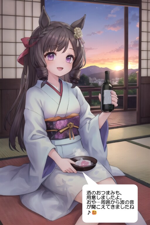 ウマ娘・ダイイチルビー、相模湾が見える温泉旅館で日本酒の入った徳利を差し出す