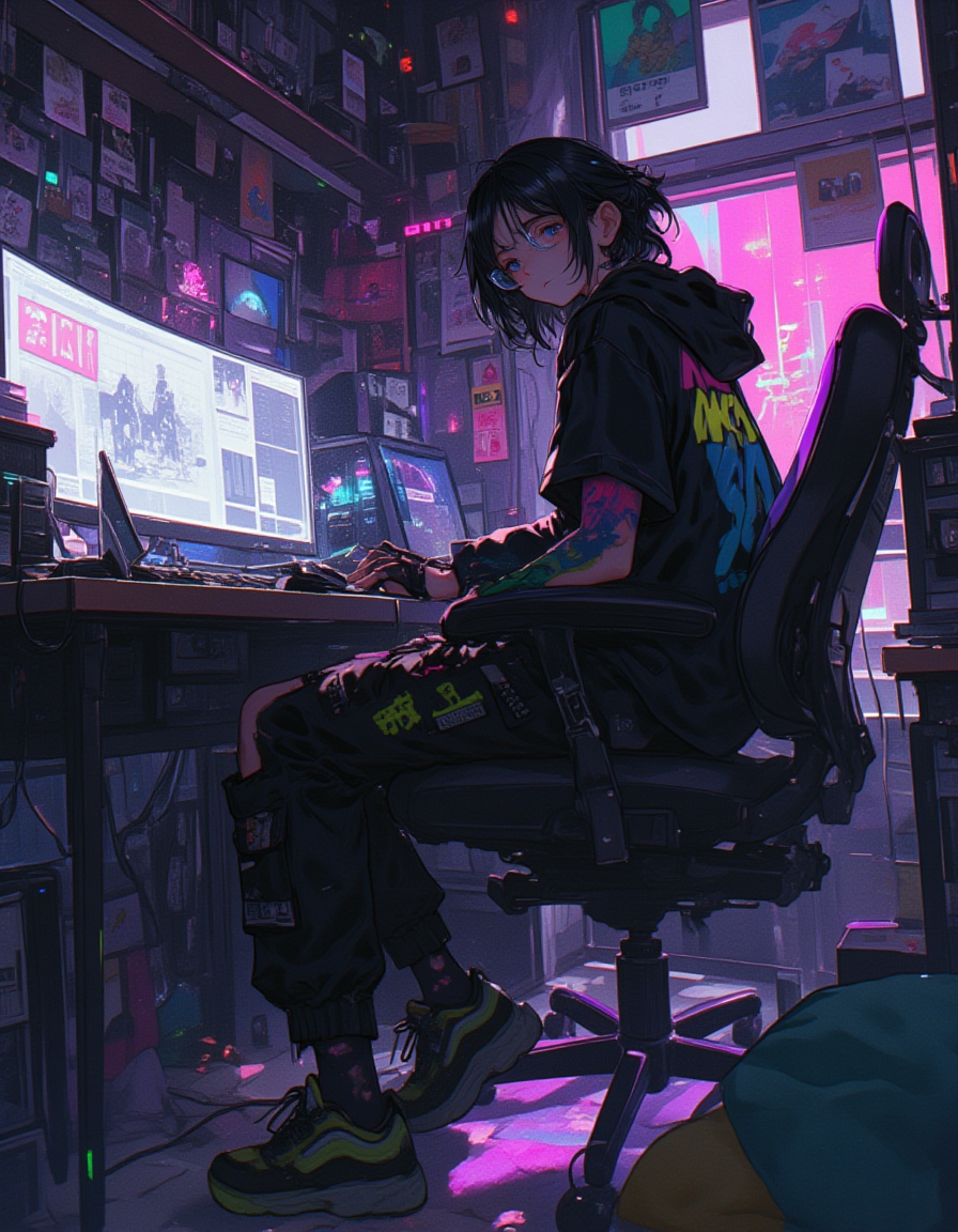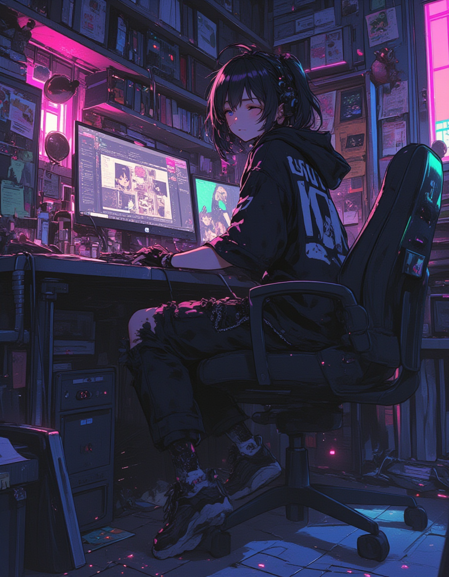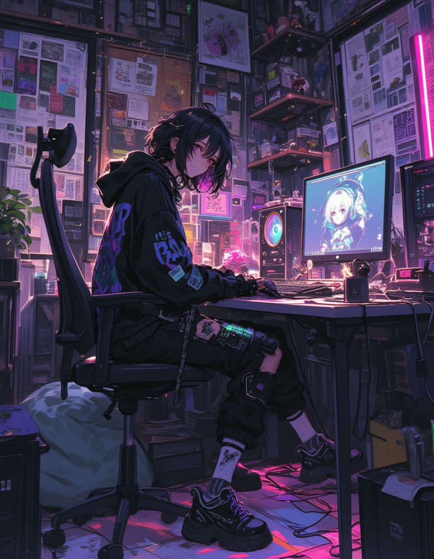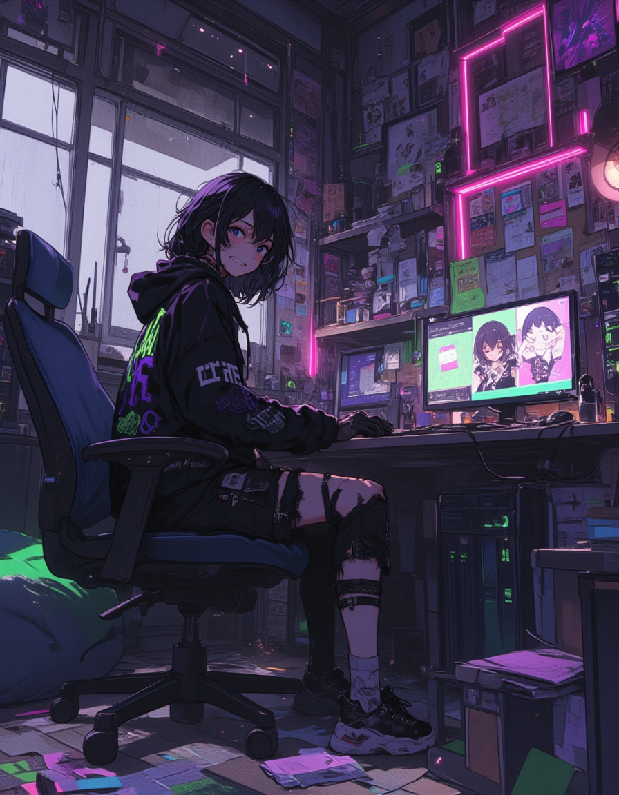Her ideal room is dimly lit,with a computer’s faint glow and neon LED strips (pink and purple) as primary light sources,creating a cozy yet moody vibe. The desk is cluttered with a high-end gaming PC,anime figurines,manga stacks,empty snack bags,and a plushie collection. Shelves overflow with merch from obscure anime and games,while walls are covered in posters of her favorite characters,fairy lights,and a corkboard with Polaroids and handwritten notes. A beanbag chair and a small kotatsu add comfort,making the space her ultimate retreat. The room feels chaotic yet curated,perfect for an introverted otaku and visually striking for SNS.,