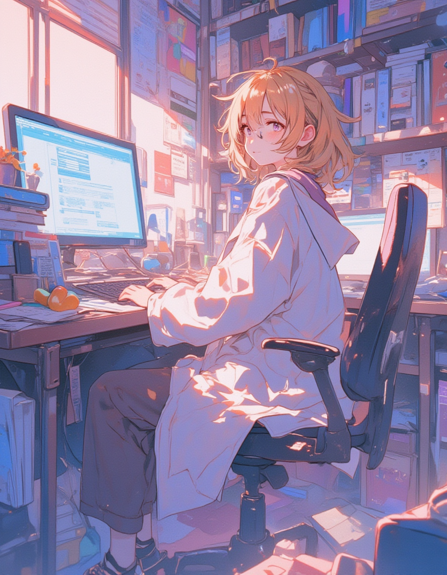 The girl is seated on an office chair,slouched heavily with a defeated yet comfortable posture,one hand on the keyboard and the other nervously adjusting her glasses or hoodie. She looks back over her shoulder with a mix of suspicion and unease,as if startled by an imagined presence.,