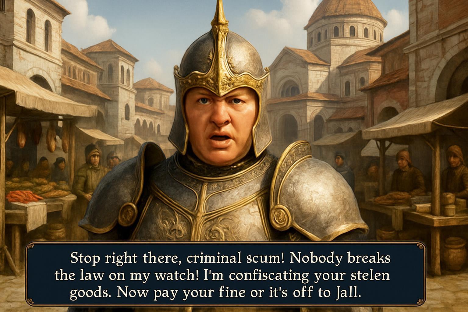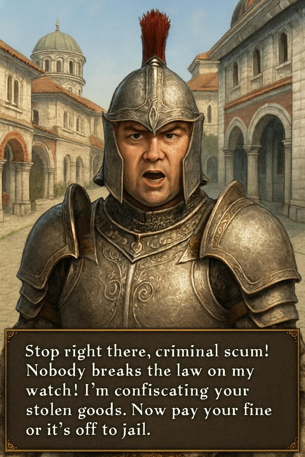彼は高価なプレートメイルと立派なヘルメットを装備した顔の丸い男で、視聴者に向かって厳しい表情で犯罪について警告しています。