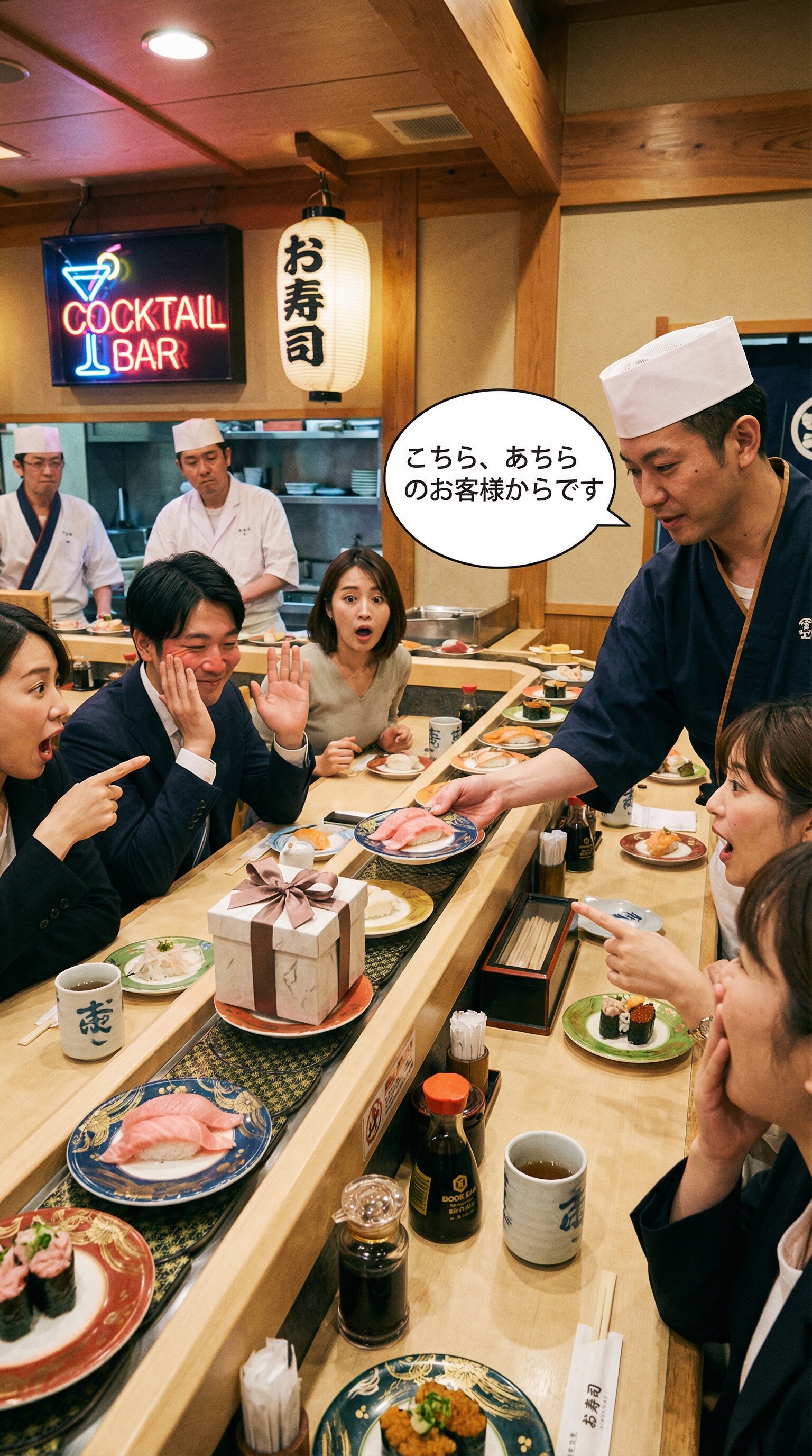 そのお店の前に寿司を握りながら眉毛を上げ下げする大きな寿司職人の