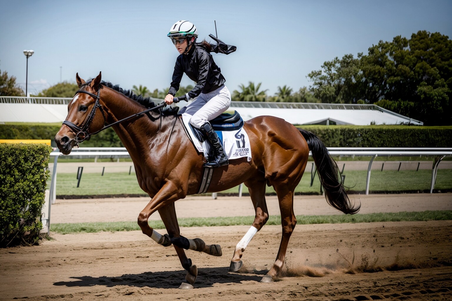 サラブレッドに乗り、颯爽と駆け抜ける美人ジョッキーちゃん。