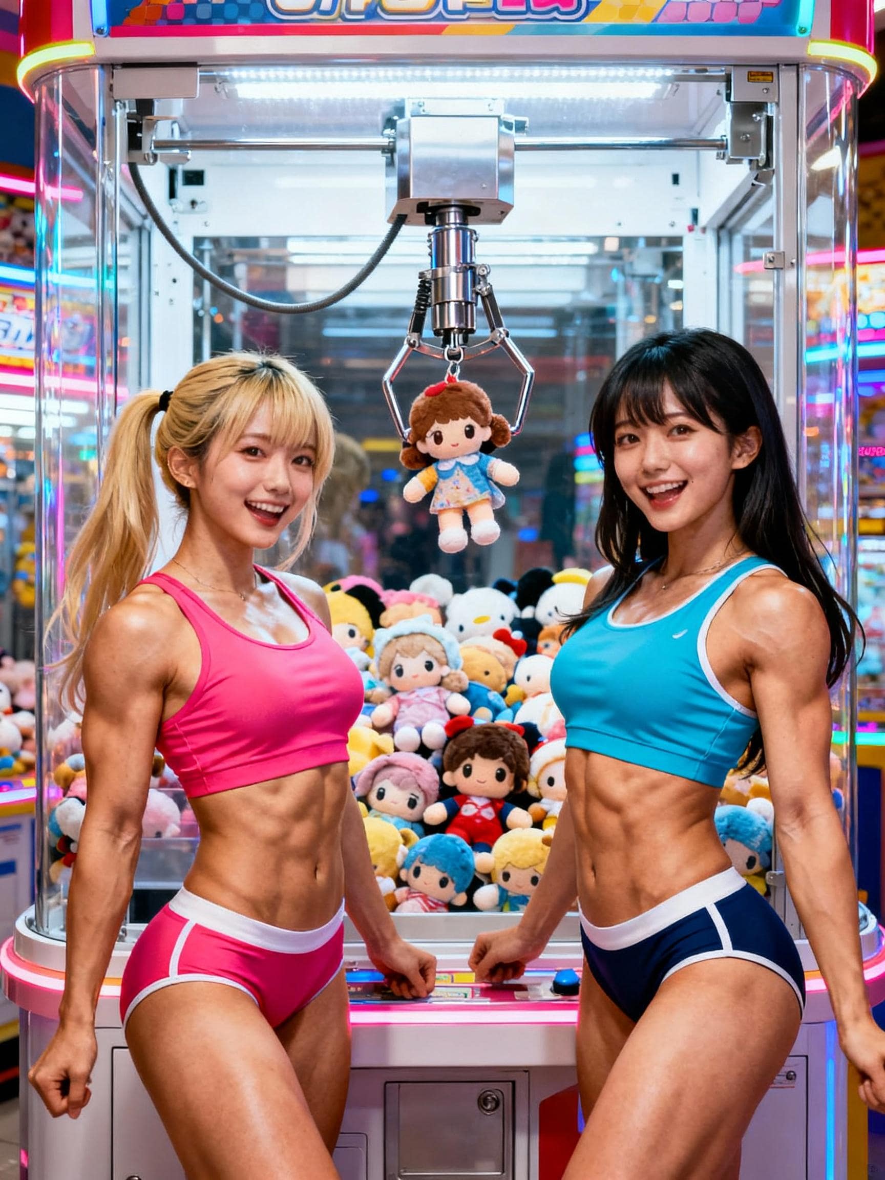 練習の合間に、UFOキャッチャーに興じる陸上競技選手