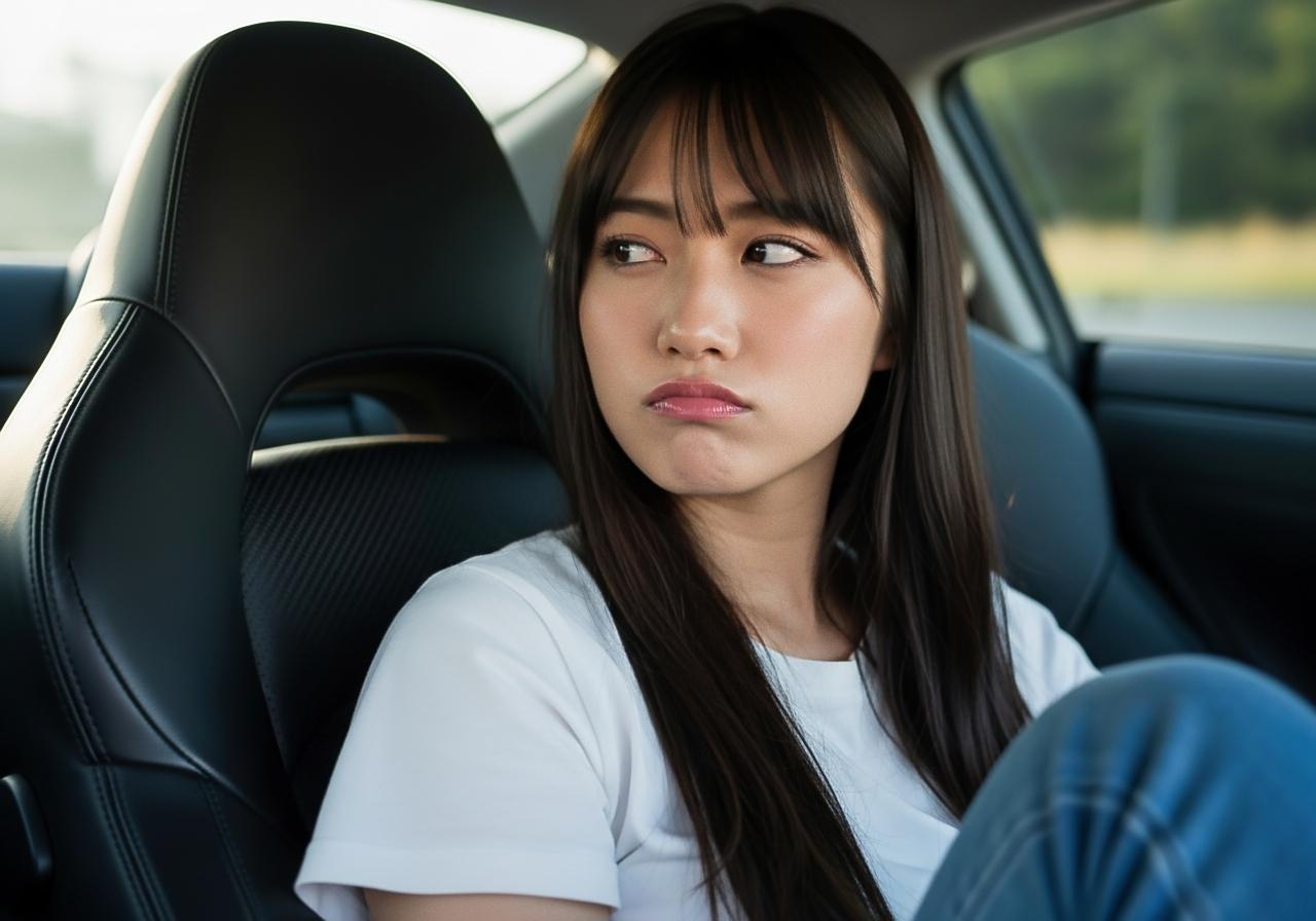 (彼女、強引にパーキングエリアで停めさせ、運転席にスッと乗り込み、慣れた手つきでシートを調整して)