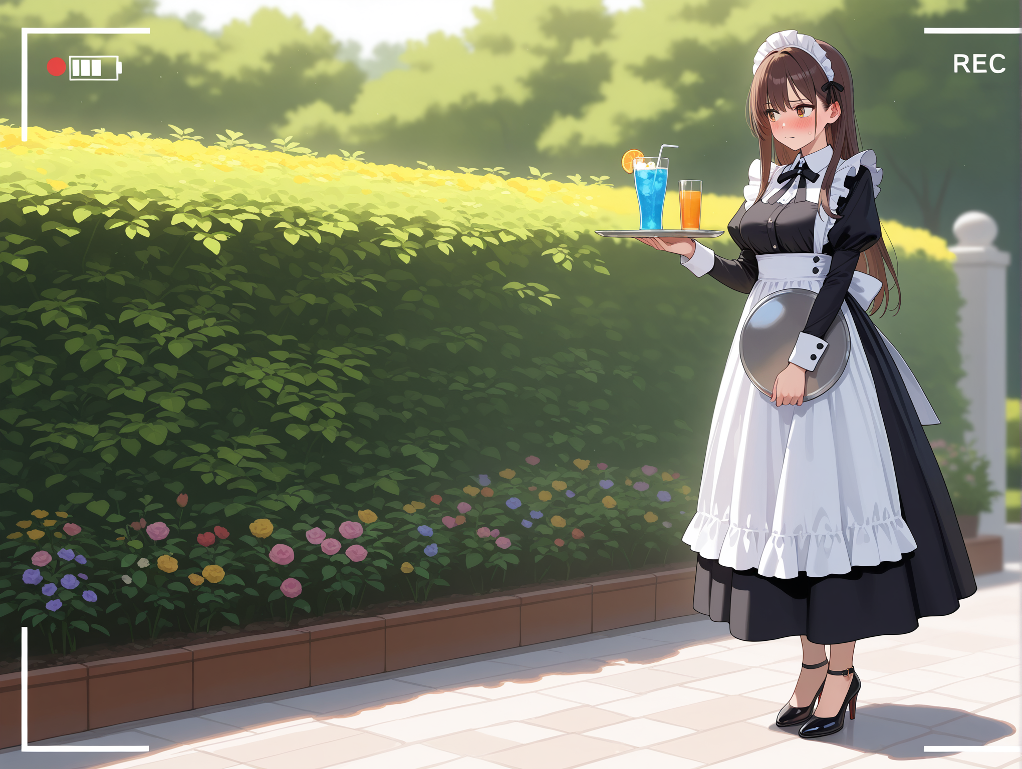 庭の中央――日当たり抜群のベンチで、メイド服姿の桐島が紅茶を差し出す構図が完成。