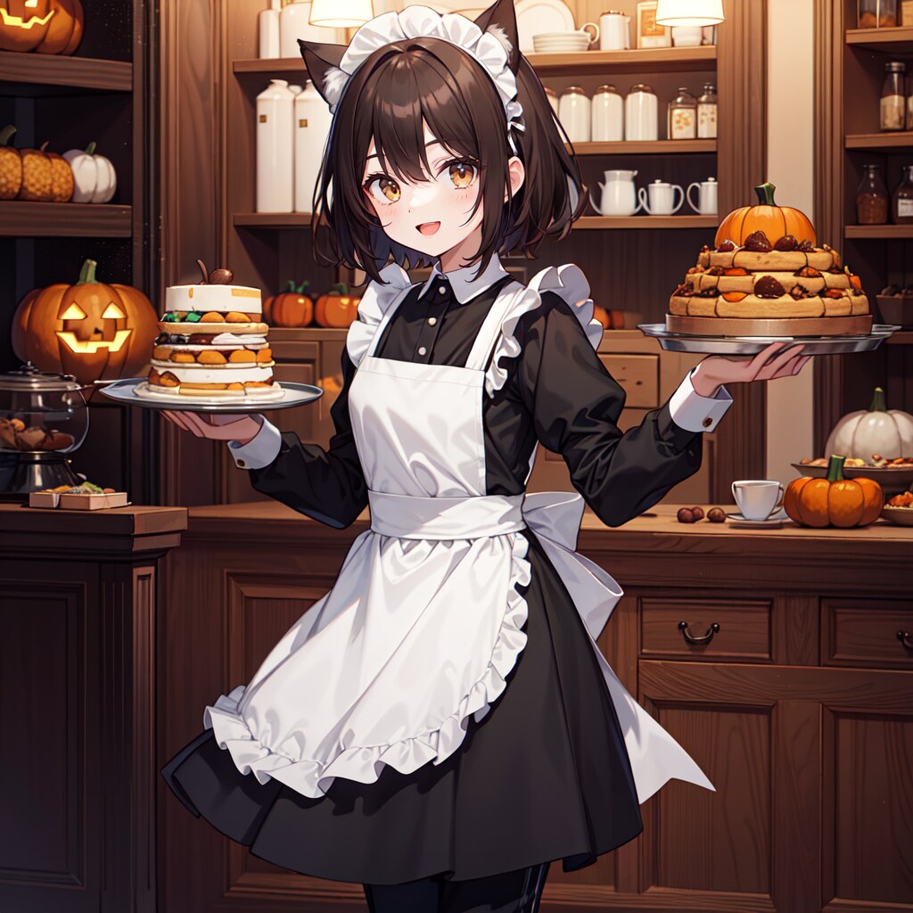南瓜と栗のケーキを運ぶ喫茶店で働く猫娘
