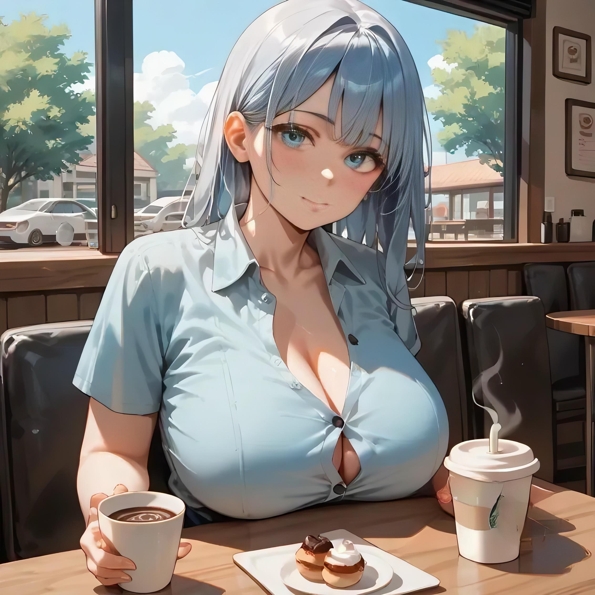 巨乳ちゃんの特権。おっぱいをテーブルに載っける。イラストではいけるがリアルスタイルにするとテーブルに載っけてくれない。うむ。