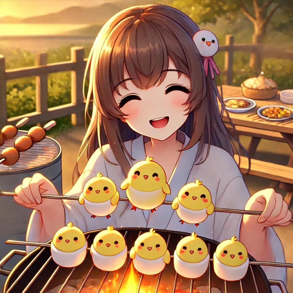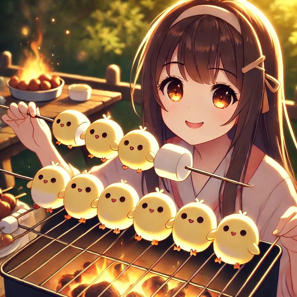 「ヒヨコ型のマシュマロを炭火で炙る少女」のアニメ調イラストです。