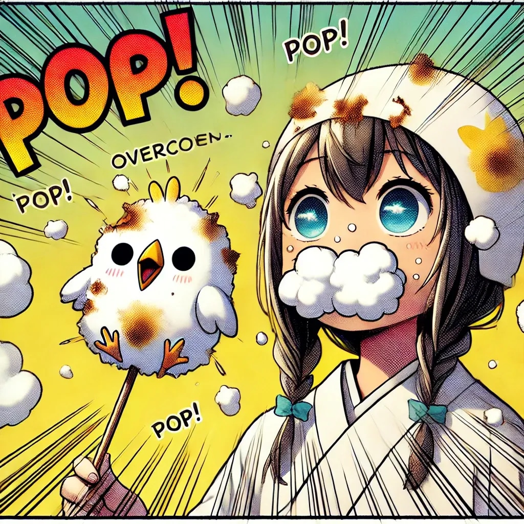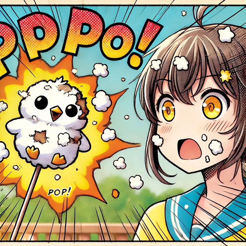 「ぷくっと膨れたヒヨコ型マシュマロがポンッ!と爆発した瞬間」のアニメ調コミック風イラストです!
