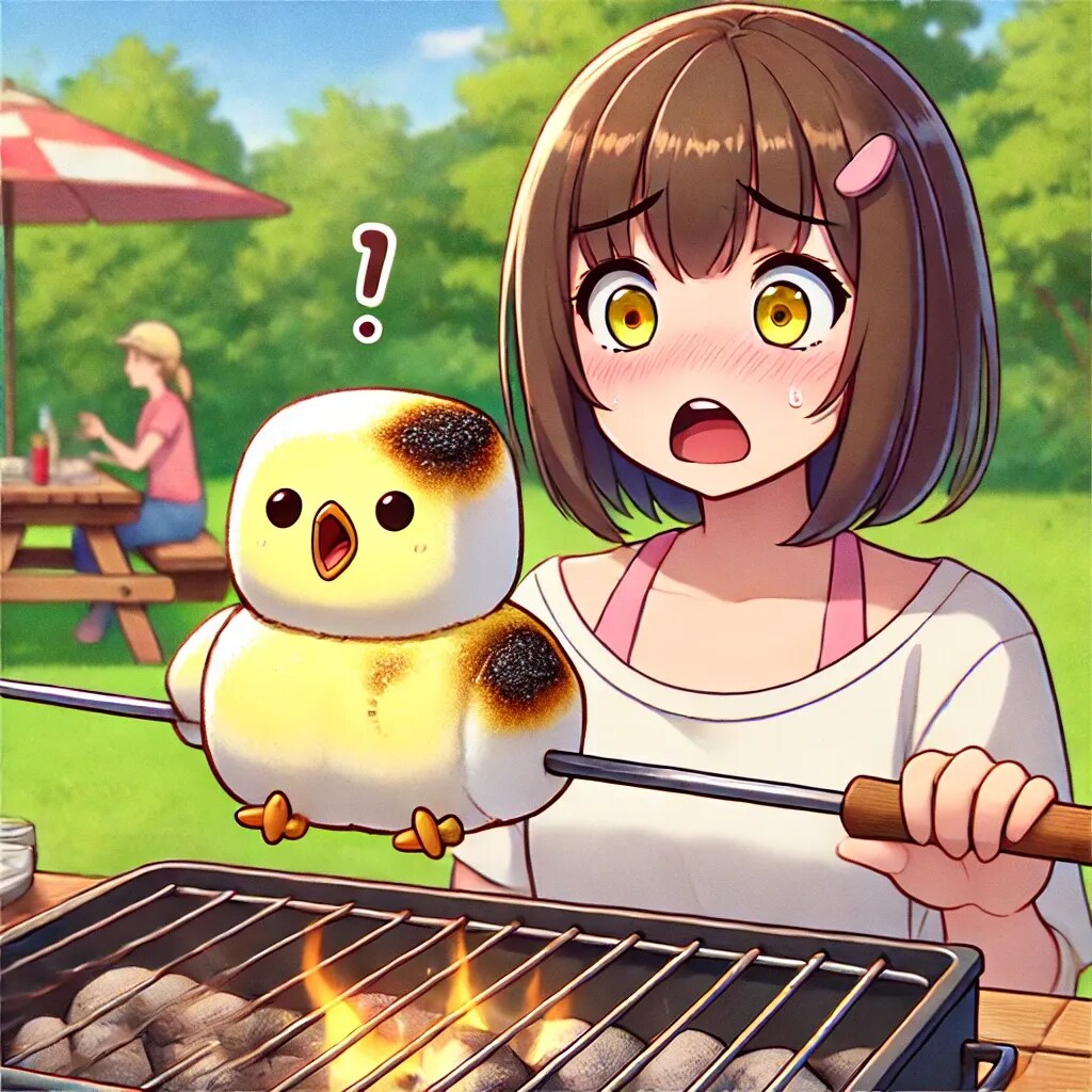 「焼きすぎてぷくっと膨れたヒヨコ型マシュマロ」を炭火で炙っている、アニメ調のユーモラスなシーンです。