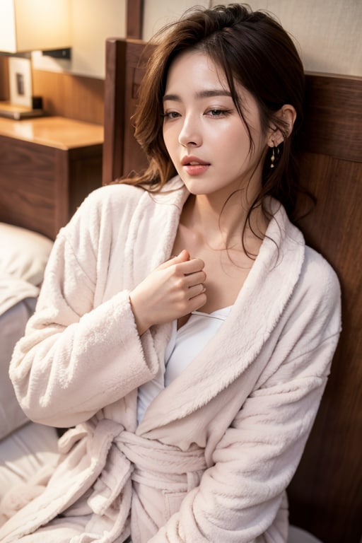 備え付けのバスローブを着て、眠たそうにしている…