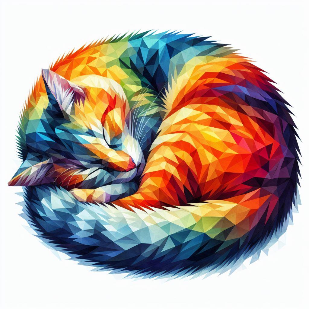 体をまるくして寝ているカラフルな猫のローポリゴンの水彩