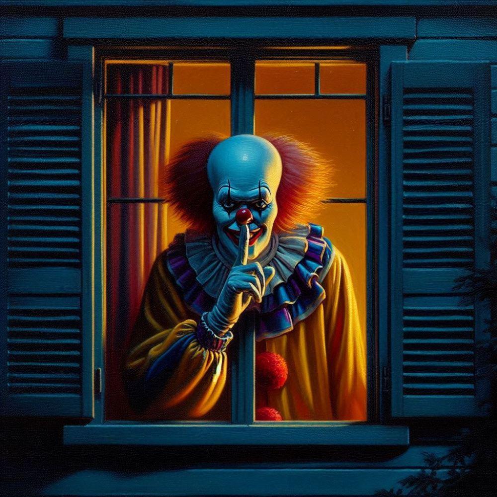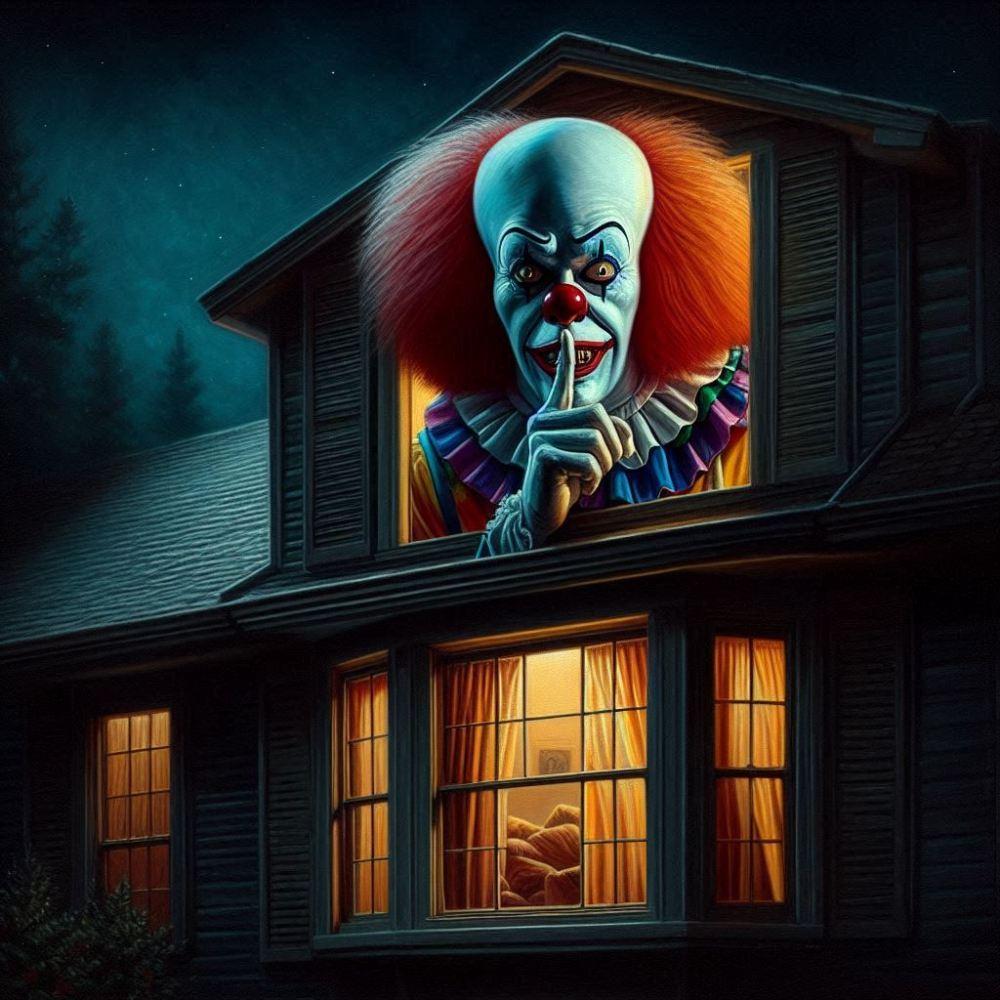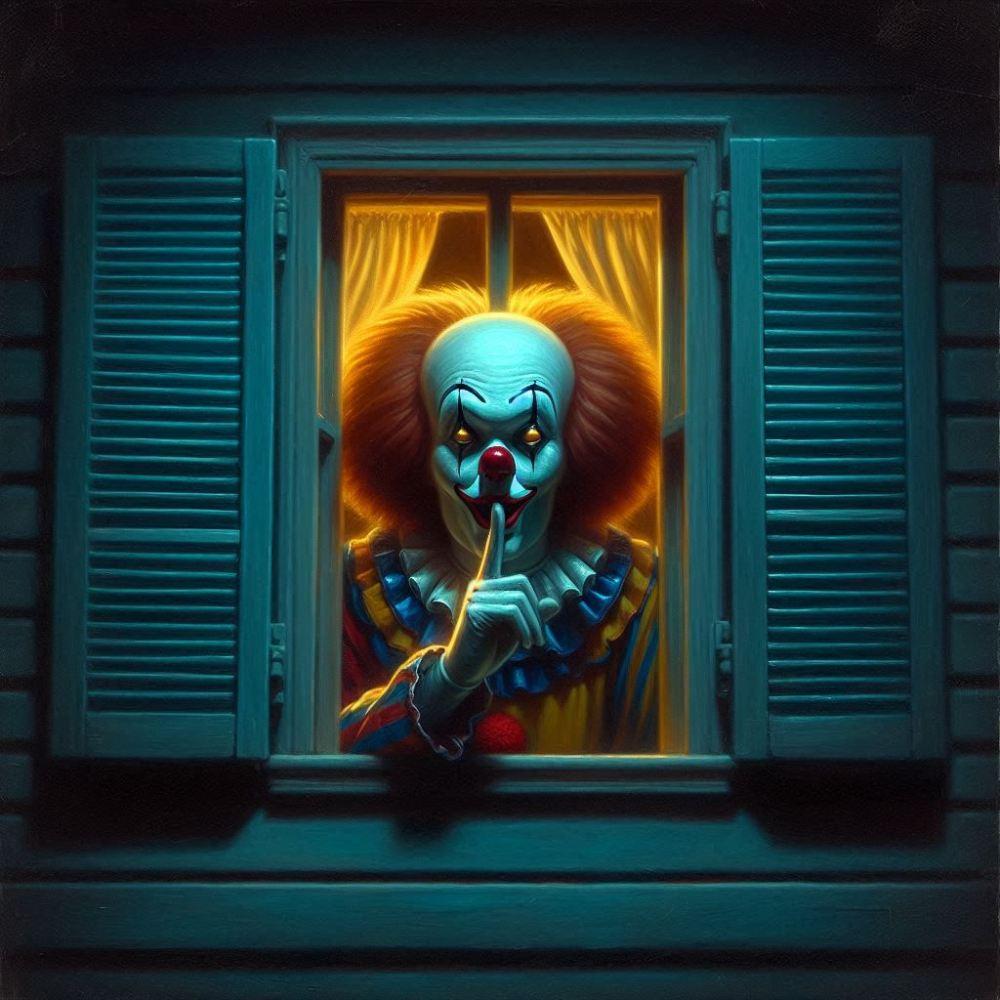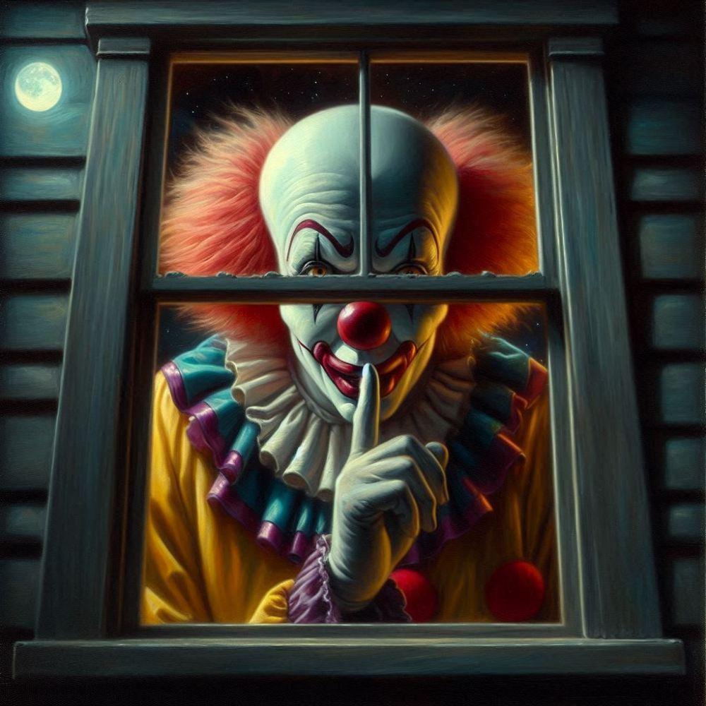 油絵ホラー、深夜こっちを見る内緒ピエロ