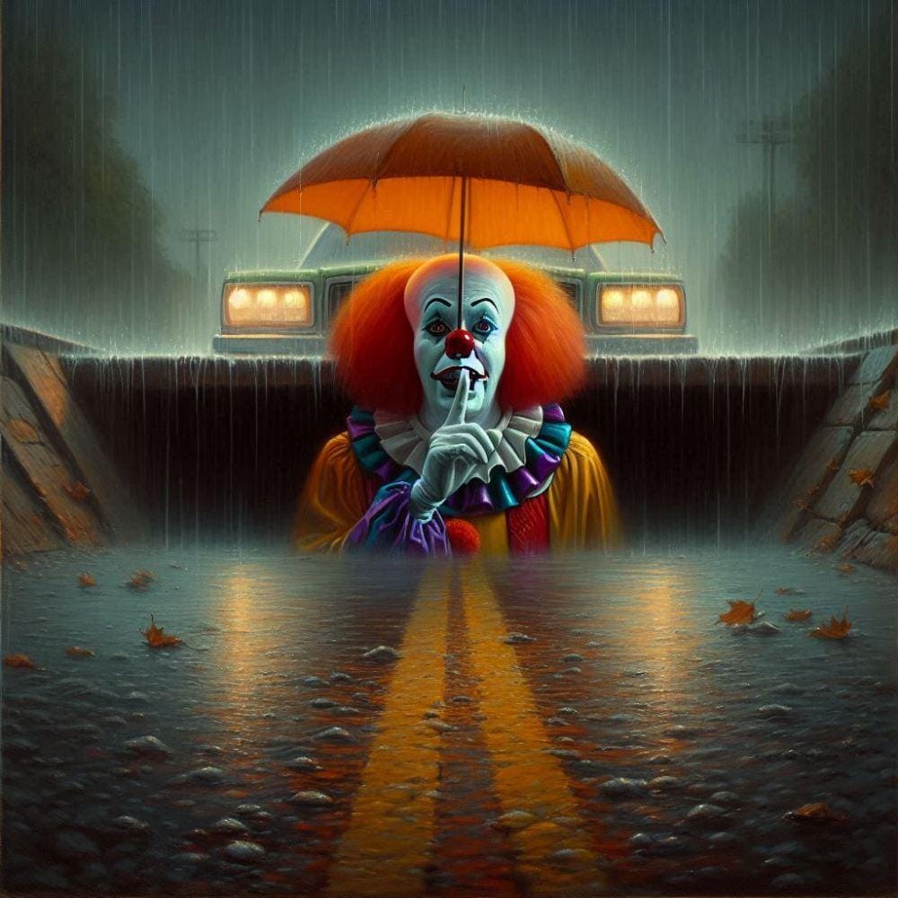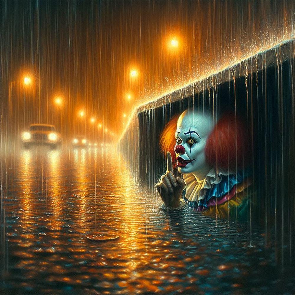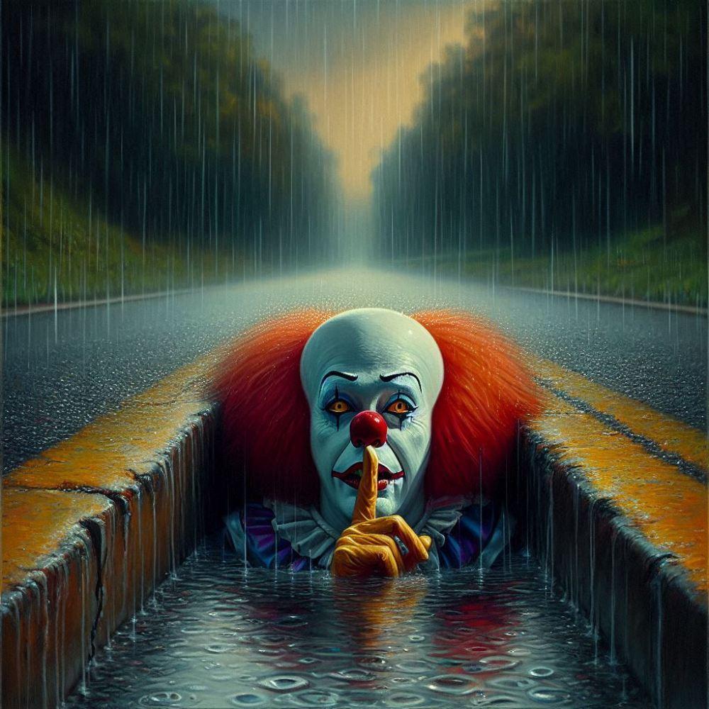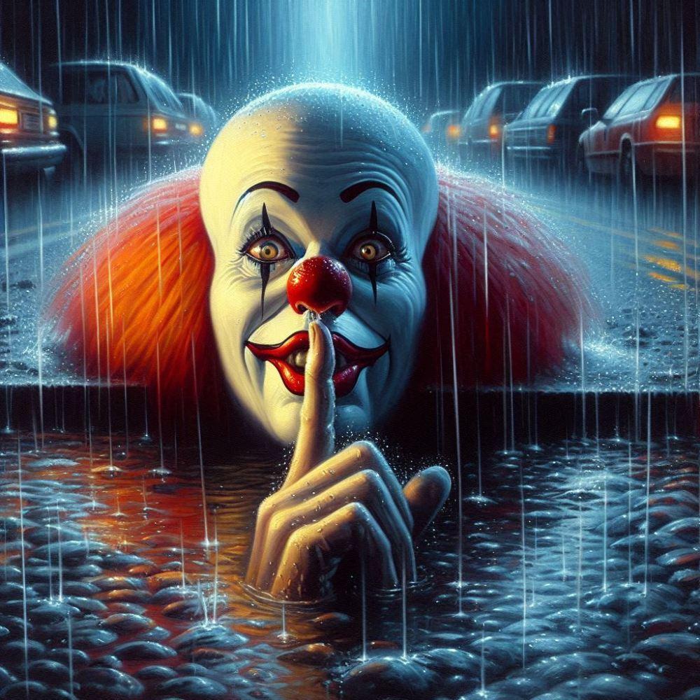 油絵ホラー、深夜こっちを見る内緒ピエロ