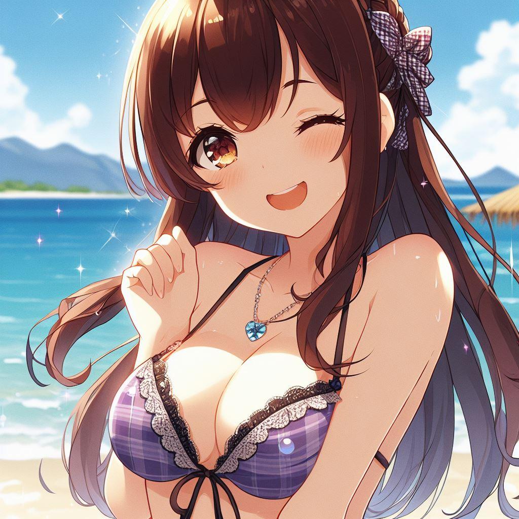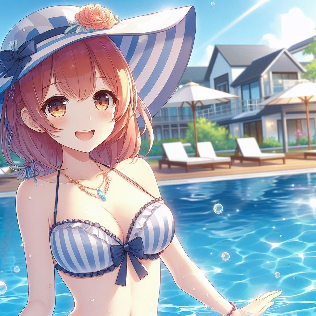 bing image creatorに投げたプロンプト:アニメ調のグラマラスな水着の美少女、リゾートホテルのプールで微笑んでいる、全身