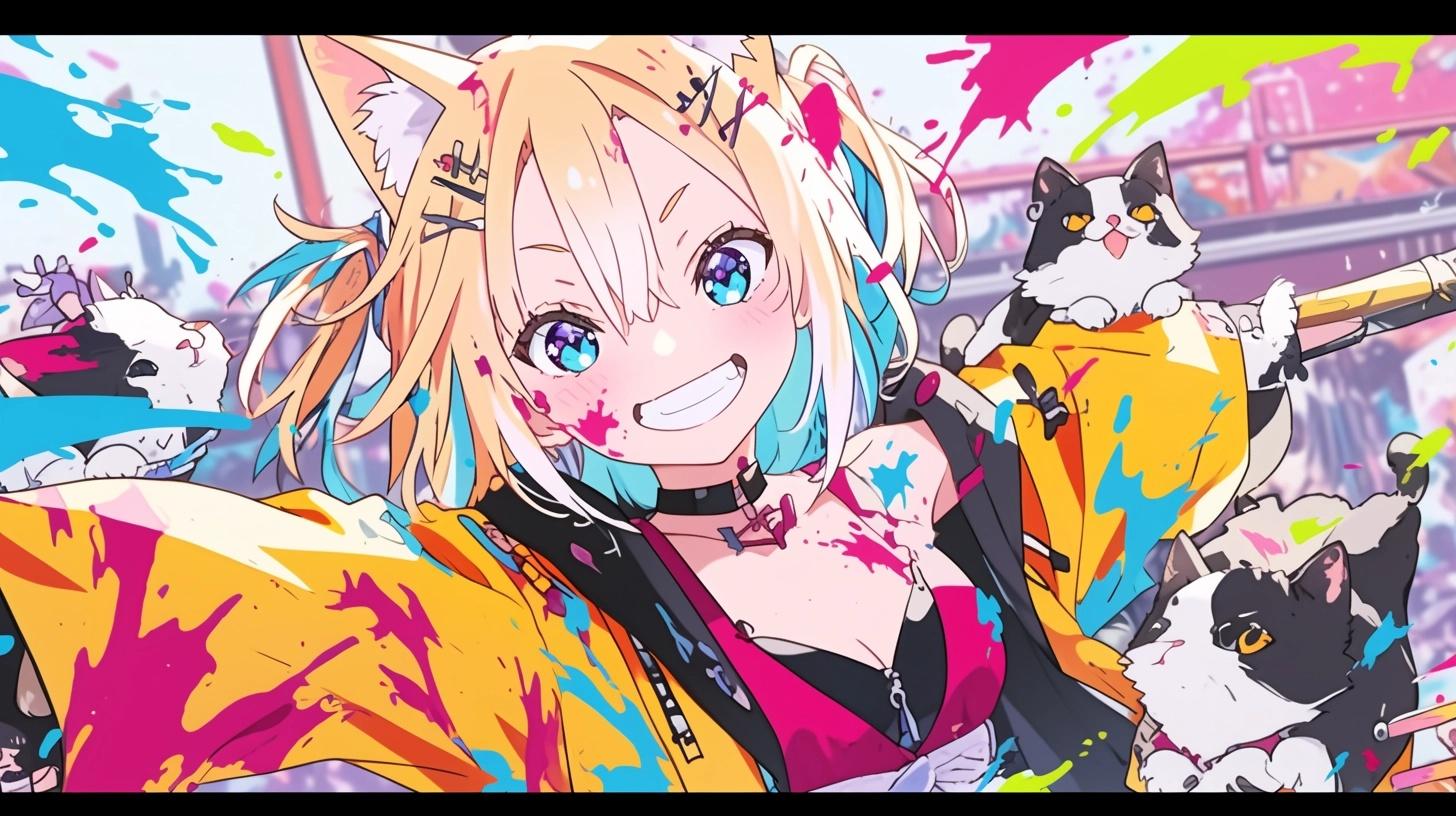 にゃんこ耳少女が描く、カラフル笑顔の大爆発!レインボースプラッシュ・フェスへようこそ!
