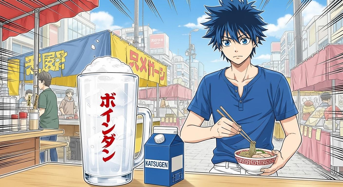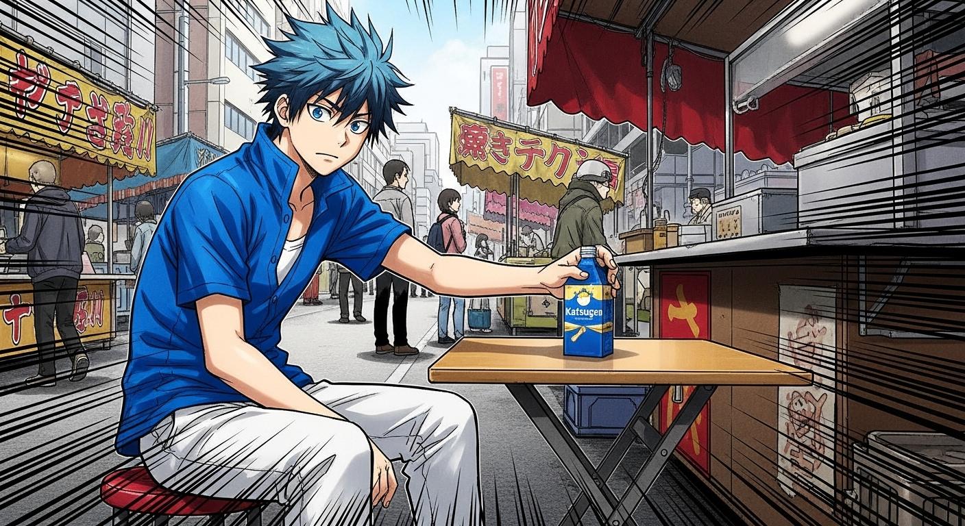 6枚目は、chatgptで、「ソフトカツゲンの擬人化の男性、紙パックのソフトカツゲンを持たせて」とリクエスト