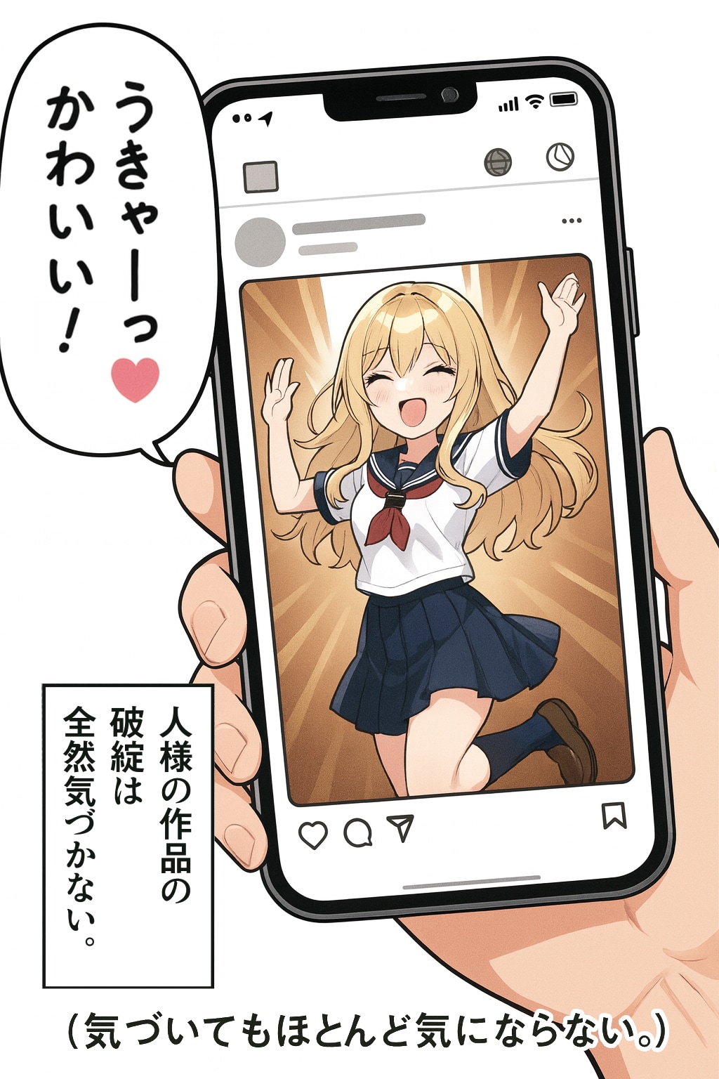こまかい破綻って自分のに対してはやたら気になりますけど他の方のに対してはそうでもないんですよね…そう考えると案外気にしてるのは自分だけかもしれません💦作品が見たいわけであって、粗探しをしたいわけじゃないですからね!
