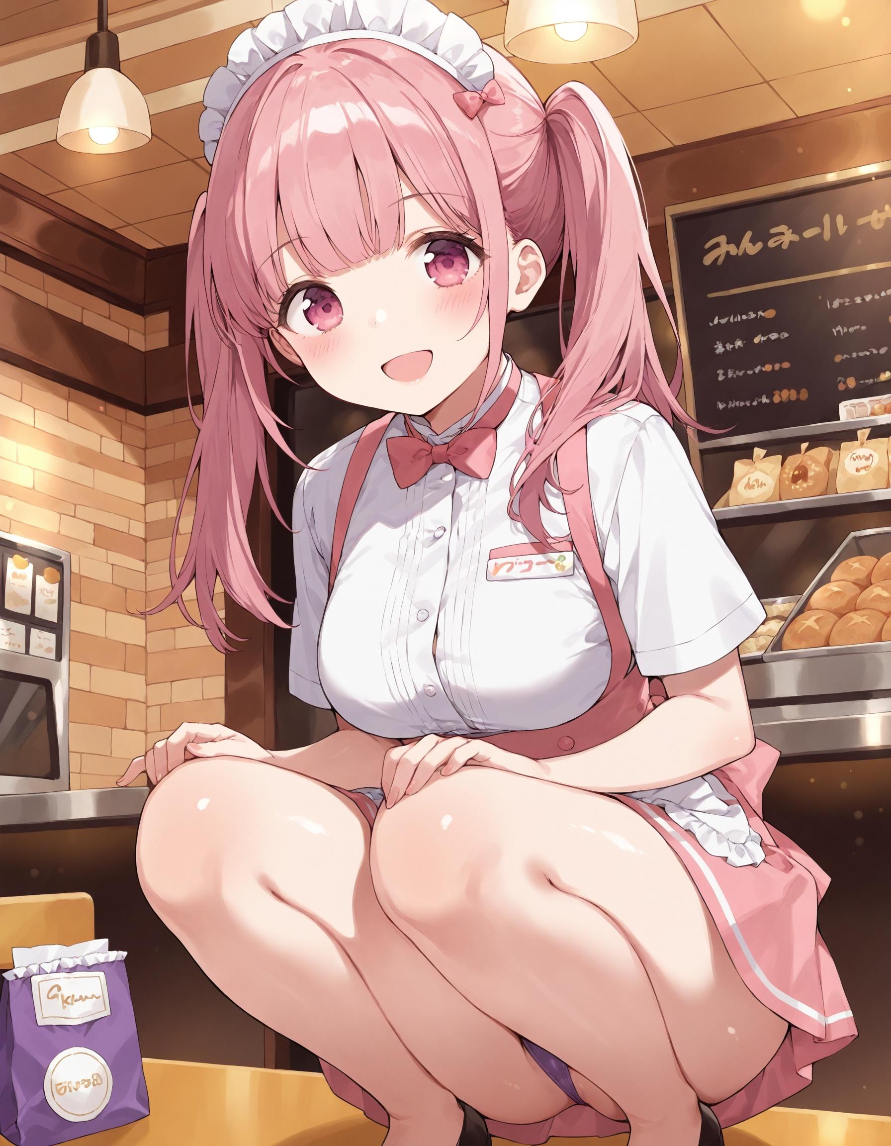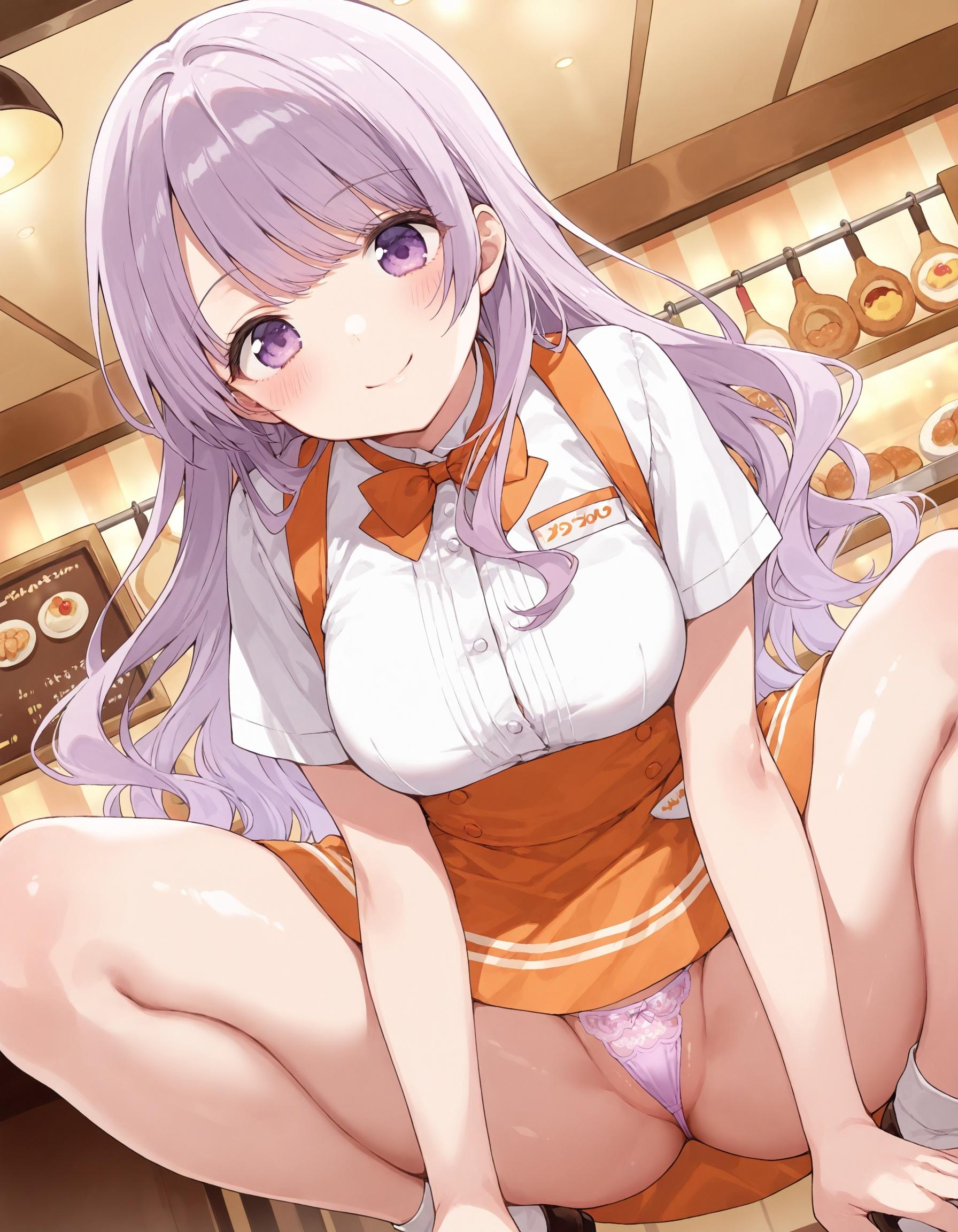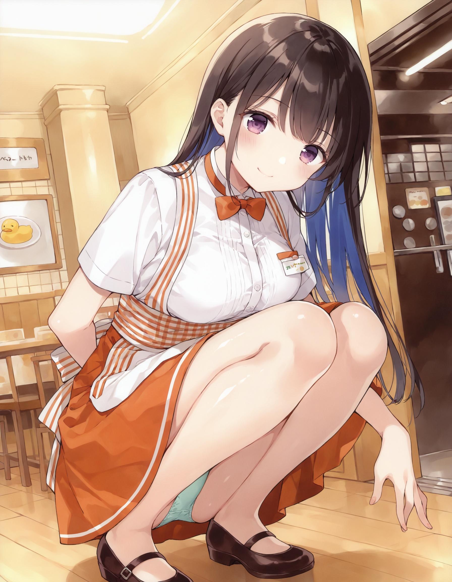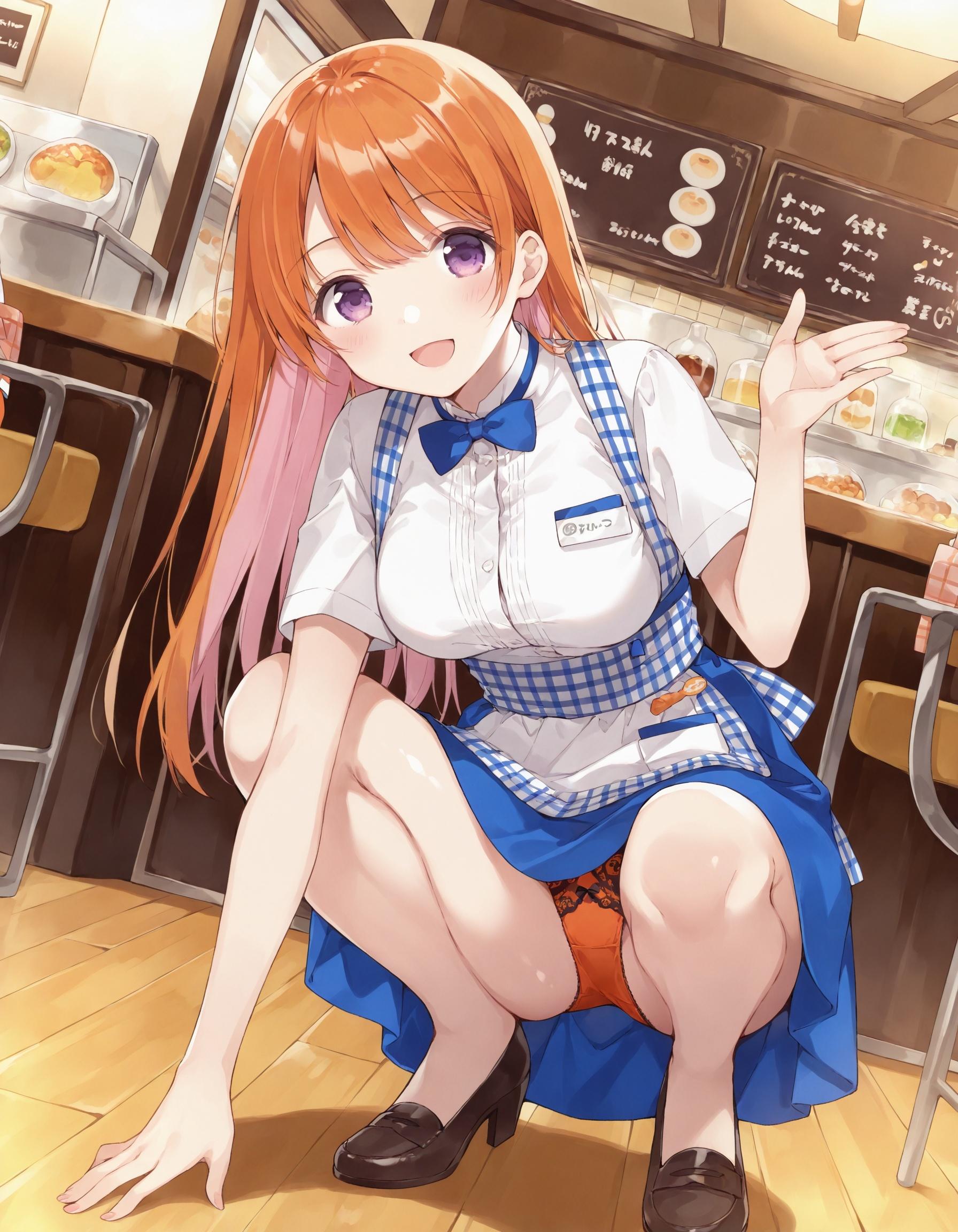レストランで笑顔で接客してくれるウエイトレスさんがしゃがんでパンチラしています。