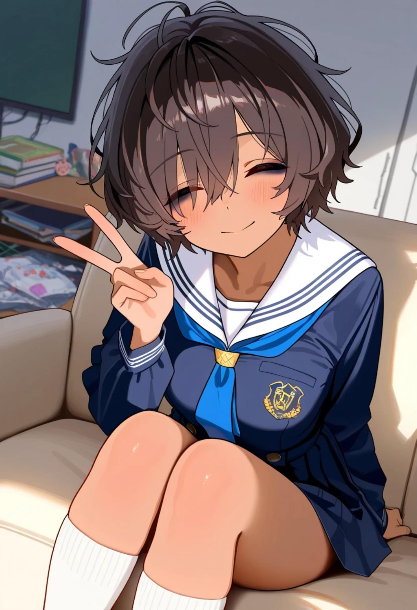 手でピースして微笑んでいる。
