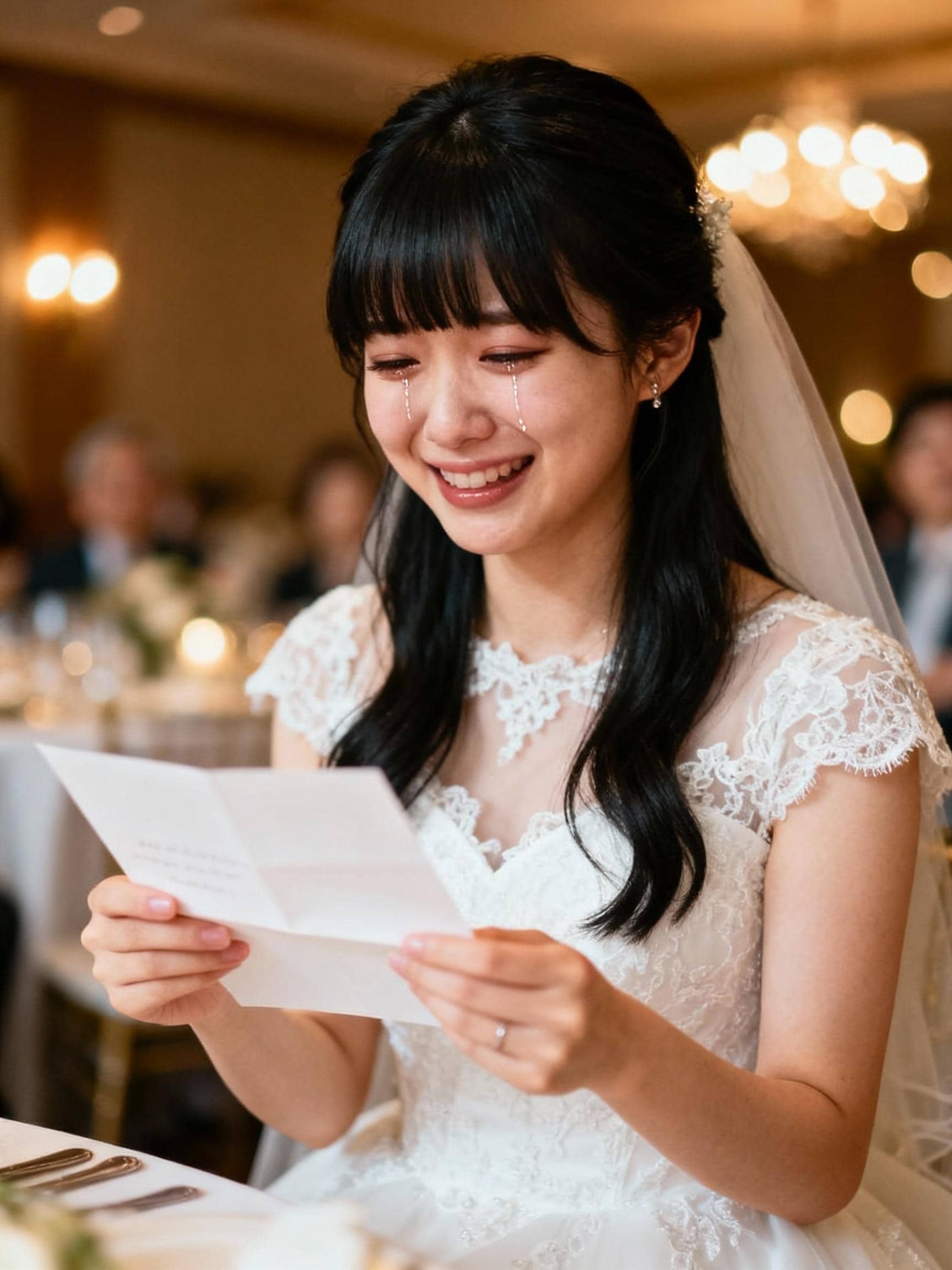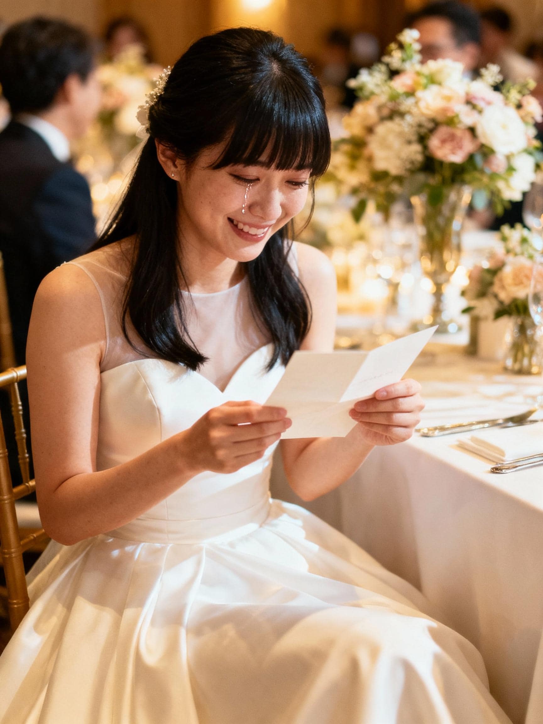 披露宴での両親への手紙で感謝の涙を流す花嫁です。