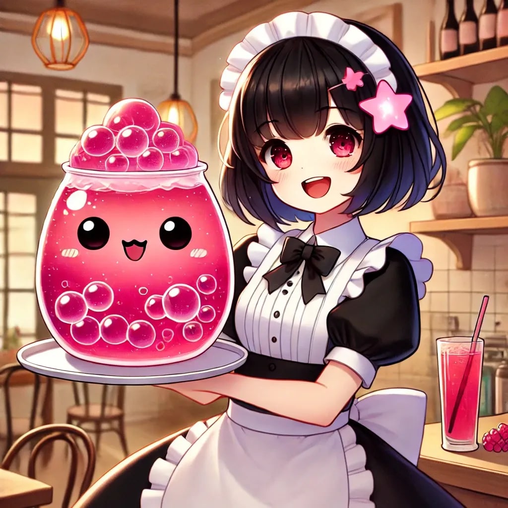 ウエイトレスの少女の優しい表情やカフェの雰囲気が、とても和やかで素敵です。😊🍹🍑