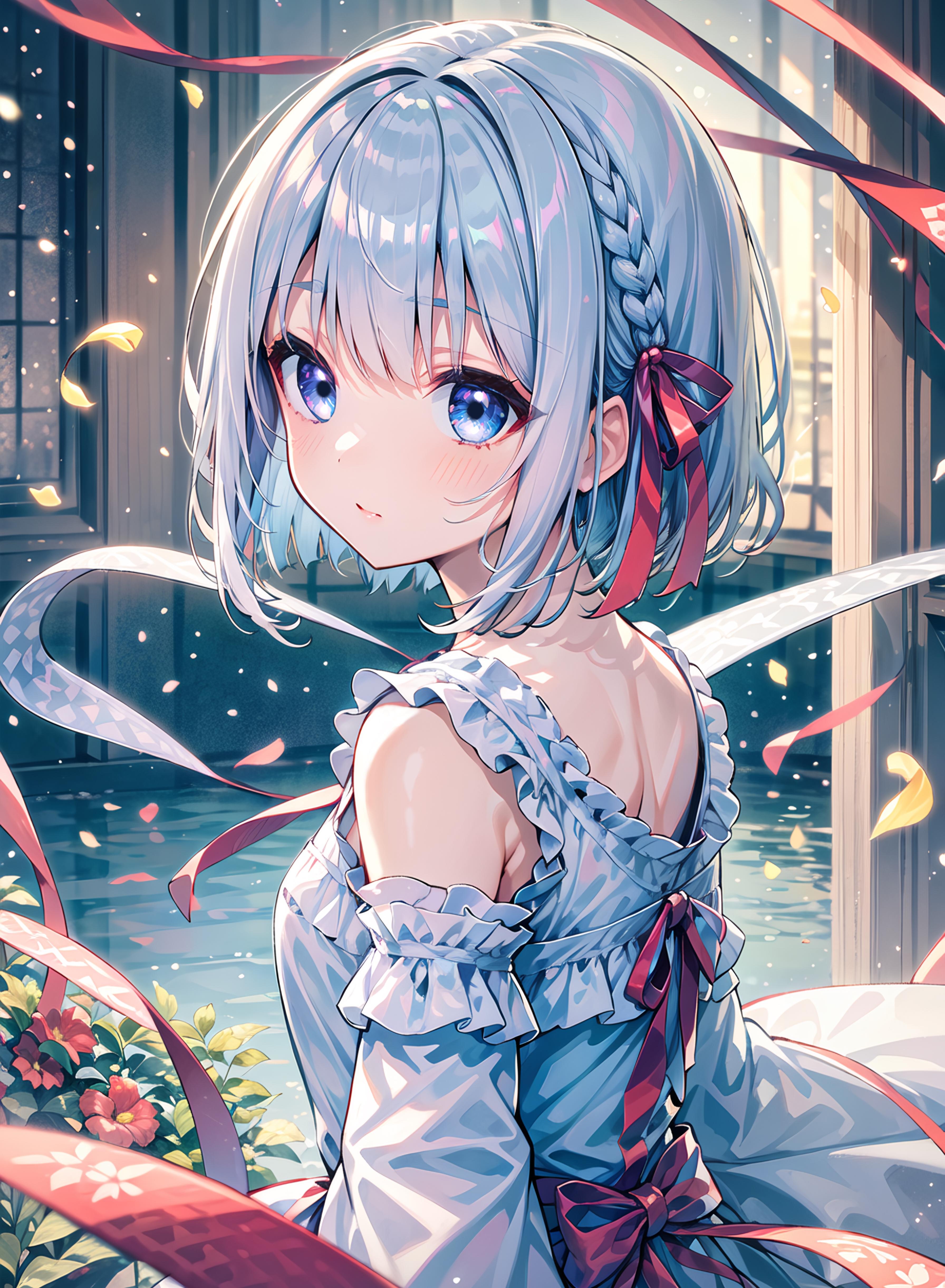 銀髪ボブカットちゃんのトレードマークの赤いリボンと銀髪、白いドレスの調和をお楽しみください。