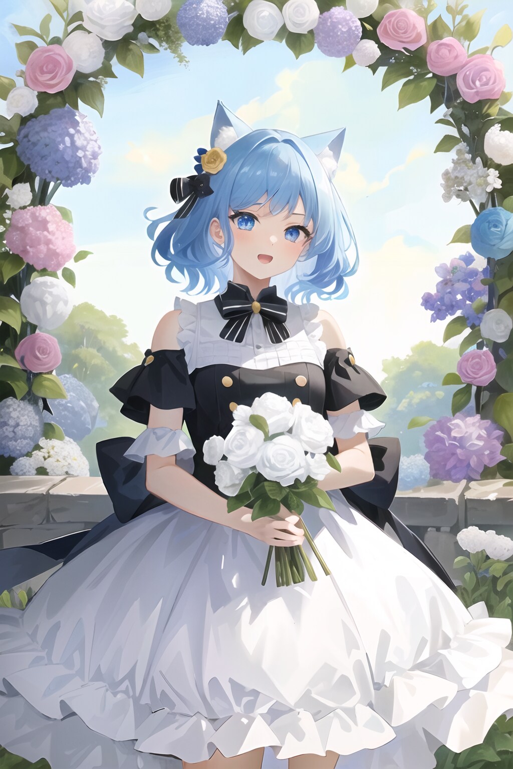 水色髪の女の子と、パステルな花の背景は合いますね。