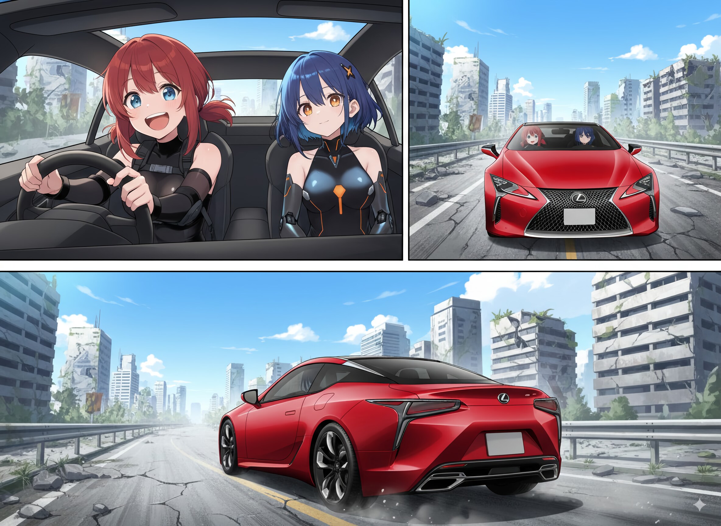 廃墟の合間を走る、新品同様に煌めく車。